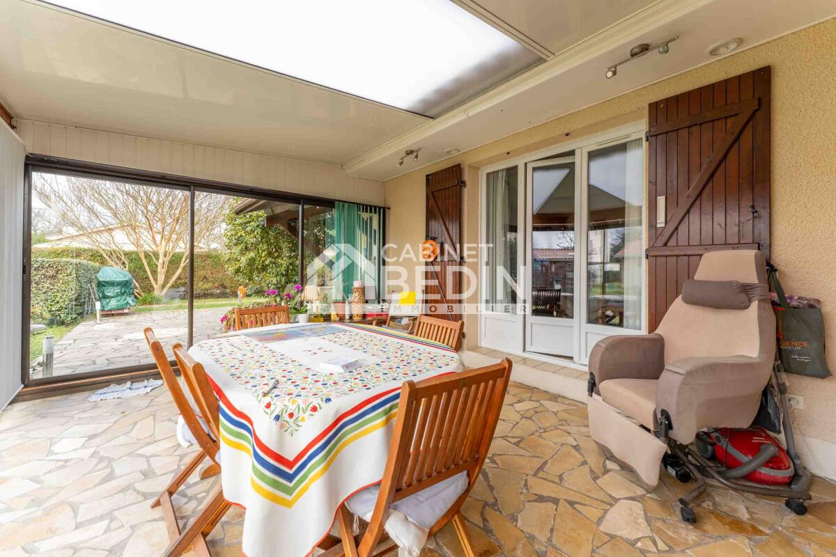 ANDERNOS SECTEUR LES MUSICIENS. Au calme, à 20 minutes à pied du bassin, maison de plain pied bien entretenue bénéficiant d'une belle parcelle de plus de 760 m² piscinable. Vous trouverez une cuisine équipée récente, salon séjour avec poêle à granules, véranda de 21 m² non chauffée, trois chambres, deux salle d'eau. Chalet en bois de 18 m² avec établi et fenêtres. Puits foré. Portail automatique. Extension possible. Contactez nous pour une visite. . Les informations sur les risques auxquels ce bien est exposé sont disponibles sur le site Géorisques : www. georisques. gouv. fr. Montant estimé des dépenses annuelles d?énergie pour un usage standard : entre 1063 et 1439 Euros/an (année de référence 2023)