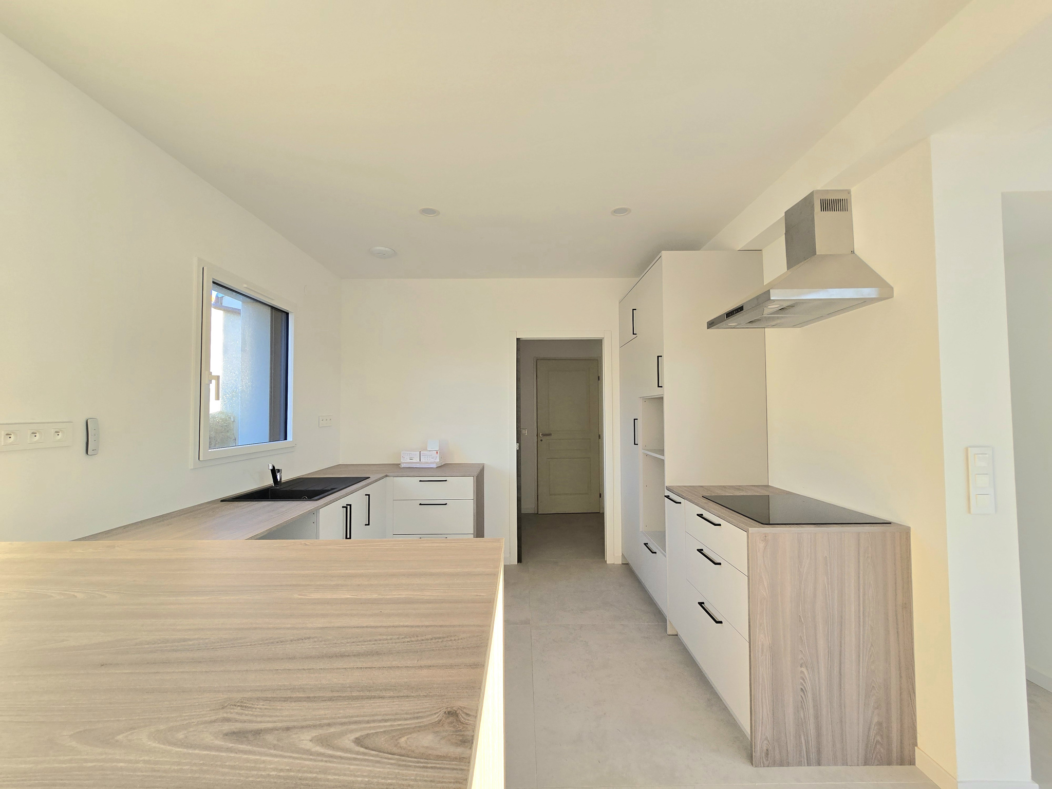 La pièce de vie, véritable coeur de la maison, séduit par ses grandes ouvertures, baignant l'espace de lumière naturelle et s'ouvrant sur une belle terrasse. La cuisine ouverte, aménagée et équipée, complète cet espace chaleureux et convivial.