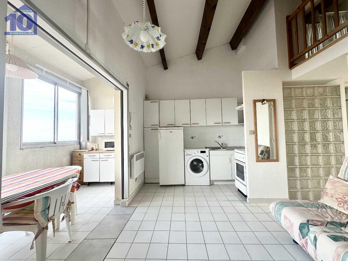 Appartement T3 vue mer, dans le secteur du casino, au dernier étage d'une résidence sécurisée avec ascenseur, de construction des années 1987, en bon état extérieur, des facades et coursives propres. L'appartement traversant offre une surface agréable comprenant un sas entrée desservant la piéce de vie avec son coin cuisine équipée; celle-ci donnant sur la loggia fermée avec vue sur la mer. Toujours au rez de chaussée une chambre en bas, une salle d'eau et son wc indépendant. A l'étage, une mezzanine servant de 2ème chambre avec un couchage en 140 cm et un lit en 90cm.