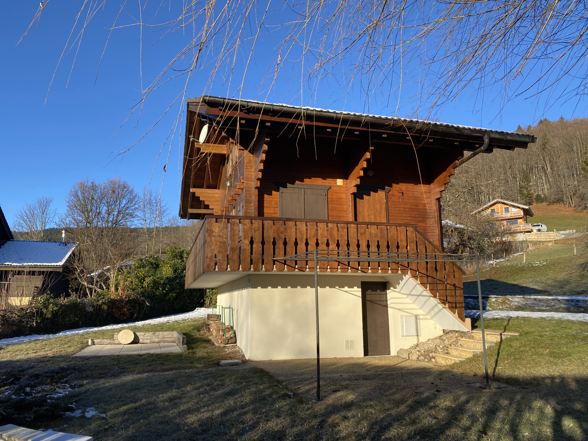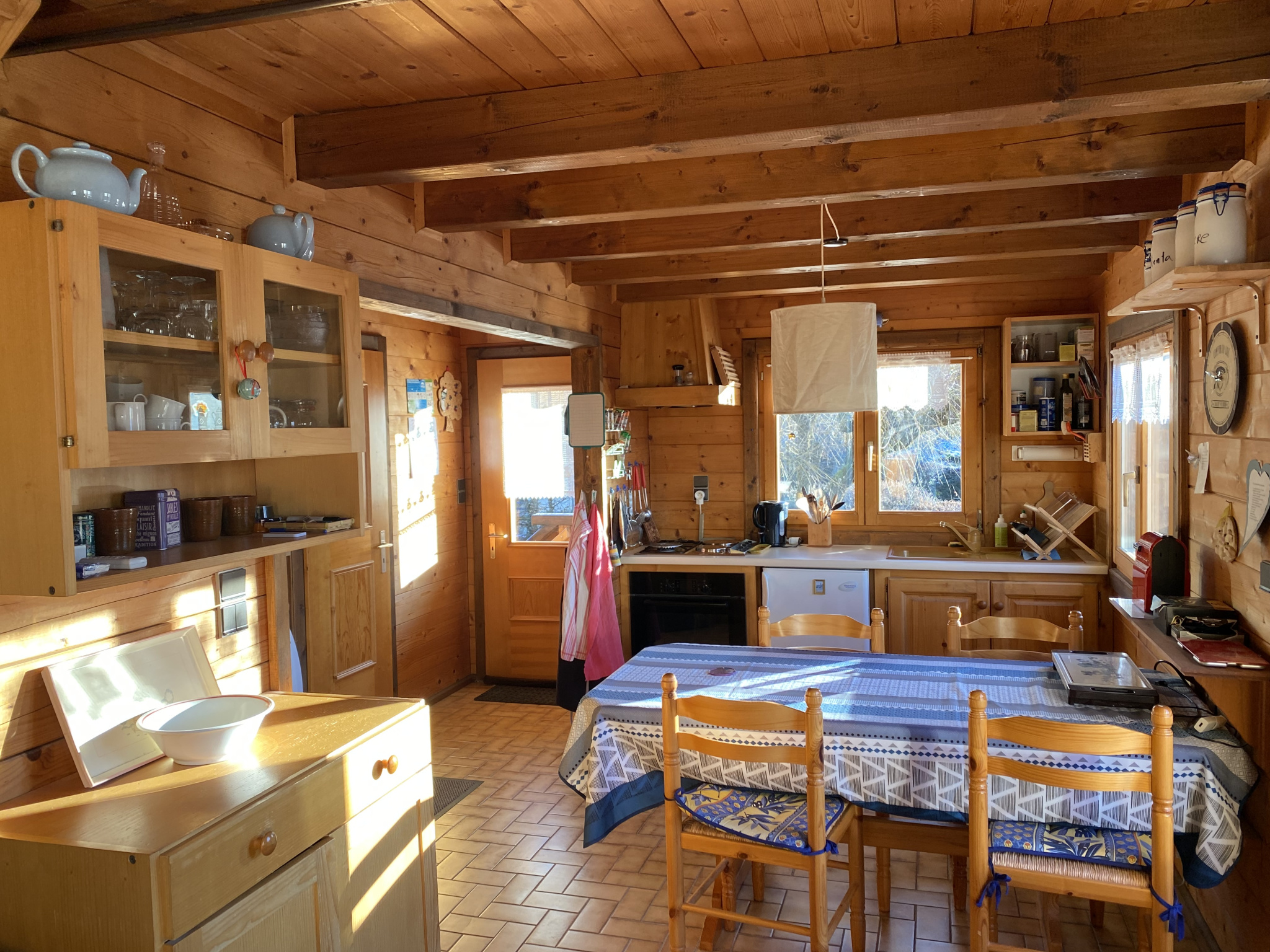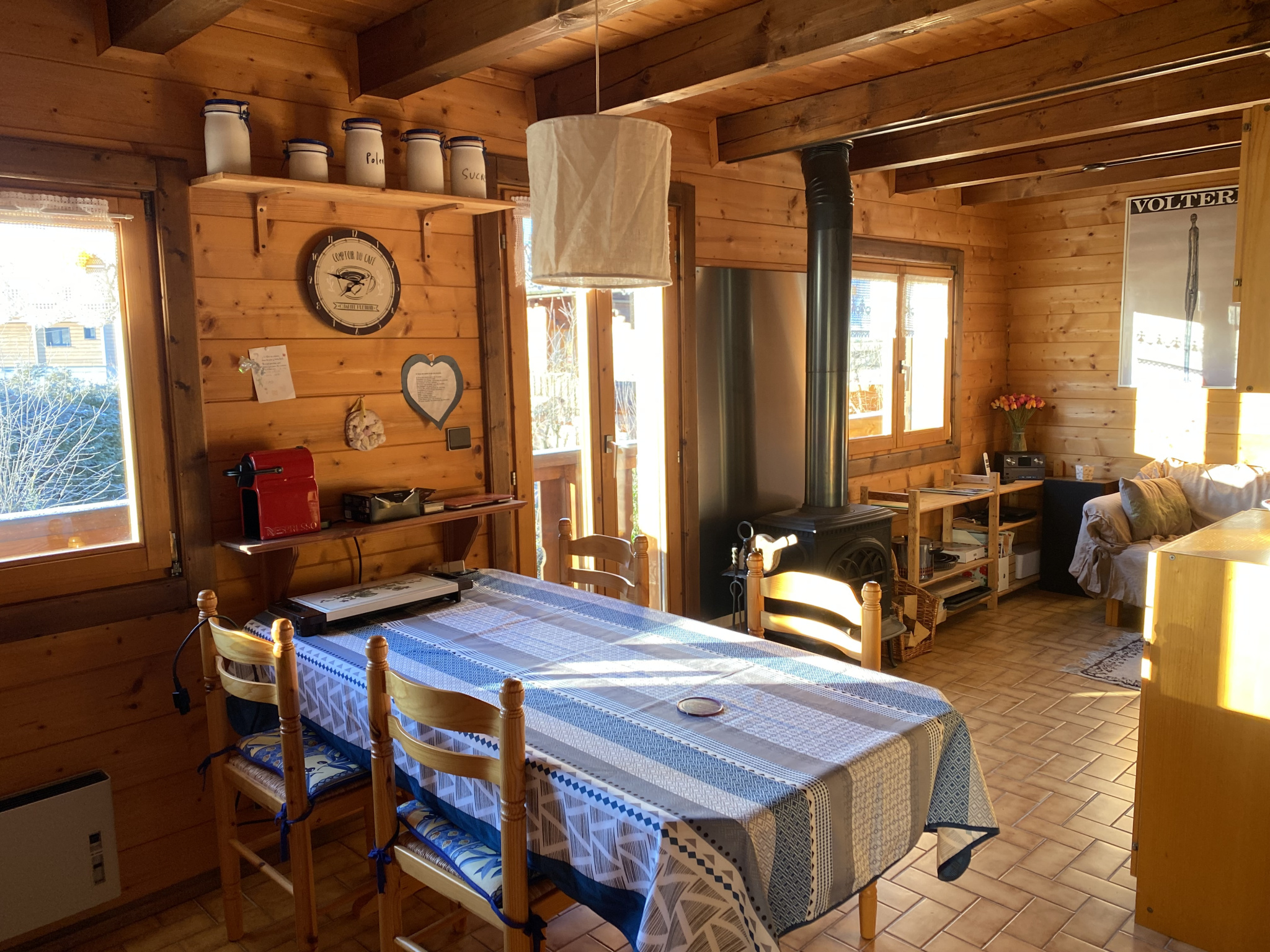 En Exclusivité sur les hauteurs d'Habère-Lullin un Chalet en copropriété horizontale de 1986 d'une surface utile de 57 m2 dont 47 m2 habitable loi carrez comprenant une entrée, cuisine ouverte sur salon/séjour, salle de bains, wc, placards et balcon; à l'étage 2 chambres et un coin nuit sous combles.