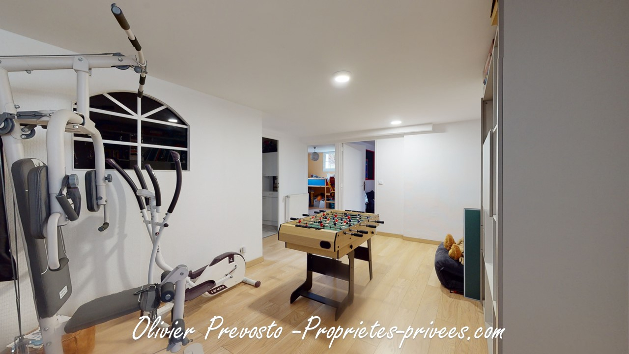 A l'étage, un couloir dessert deux chambres avec chacune leur placard et leur balcon, une salle de bain avec douche et un espace dressing . Enfin, en rez de jardin sur un demi niveau, une grande pièce de vie (salle de jeu pour les enfants, espace bureau, salle de sport...) donne accès à cinq nouvelles chambres, une salle d'eau et une buanderie. Une de ces chambres possède son solarium.