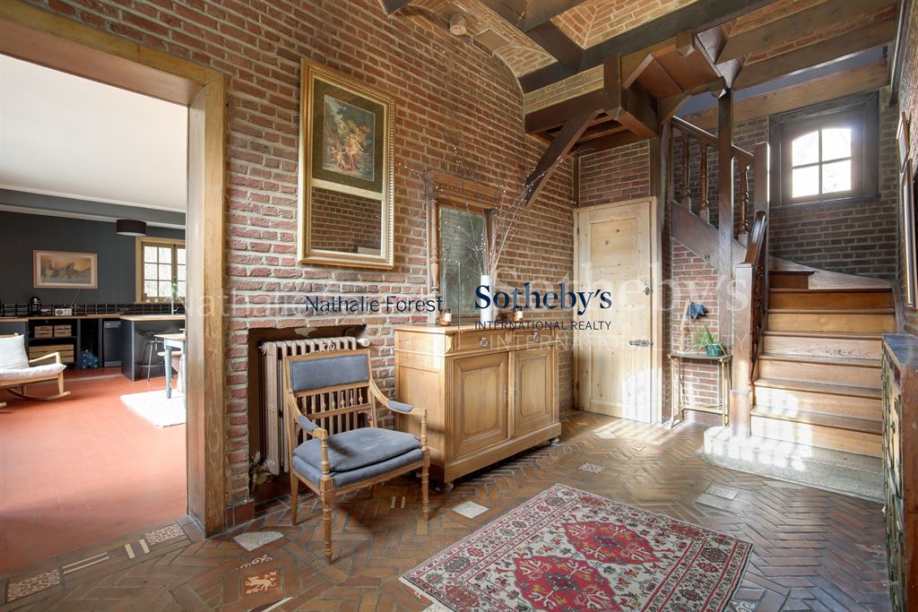 Dès l’entrée, le ton est donné : hall élégant, vestiaire, toilettes invités, puis un bureau raffiné aux boiseries d’époque. Le vaste séjour traversant d’environ 45 m² séduit par ses volumes et sa cheminée magistrale en pierre du XVIIe siècle, véritable pièce maîtresse. La salle à manger attenante est sublimée par de ravissants voussoirs en briques, typiques de l’architecture régionale.