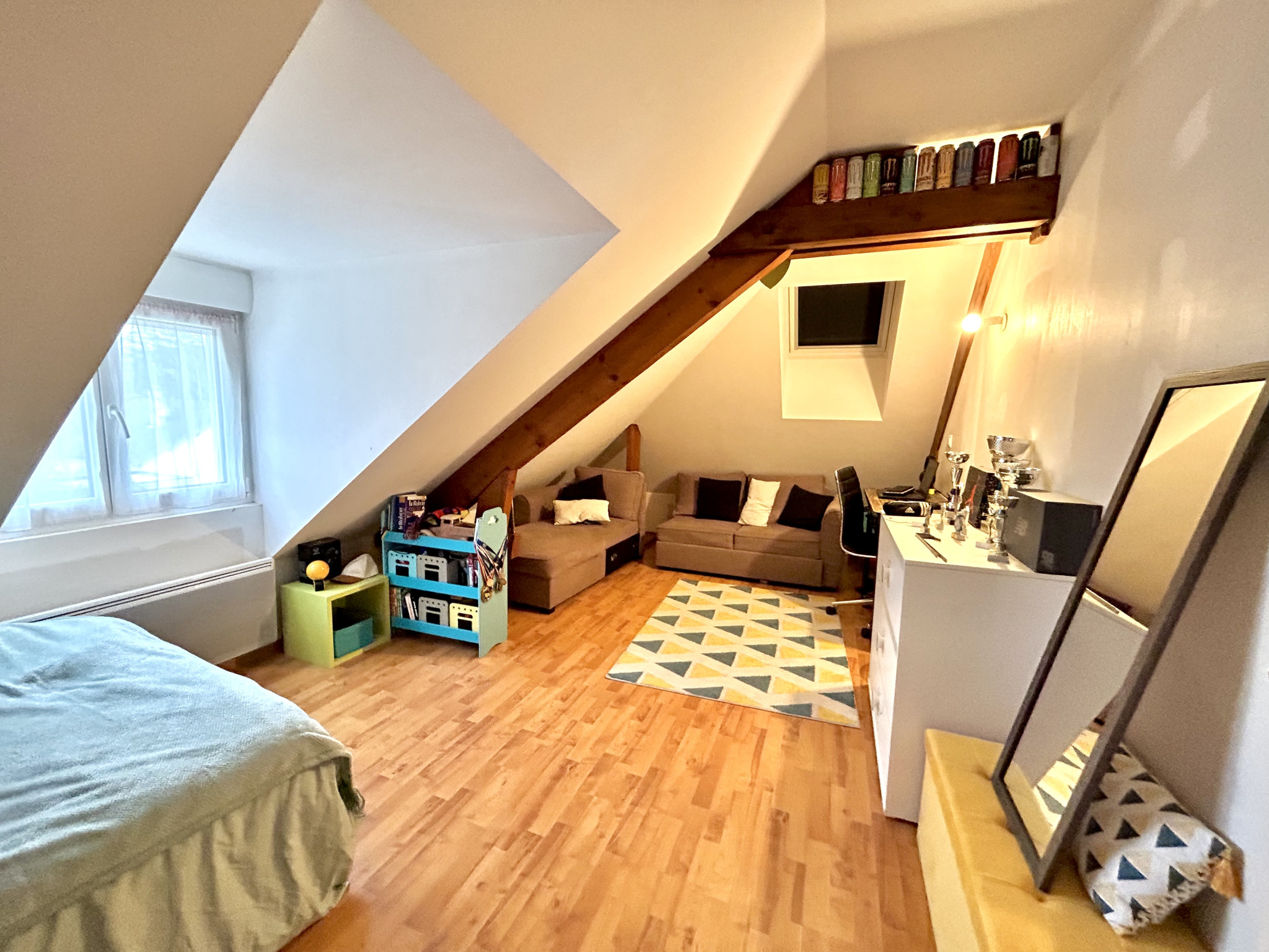 A l'étage 2 grandes chambres, une mezzanine ( possibilité d'y faire une chambre), une salle de bains et un wc.