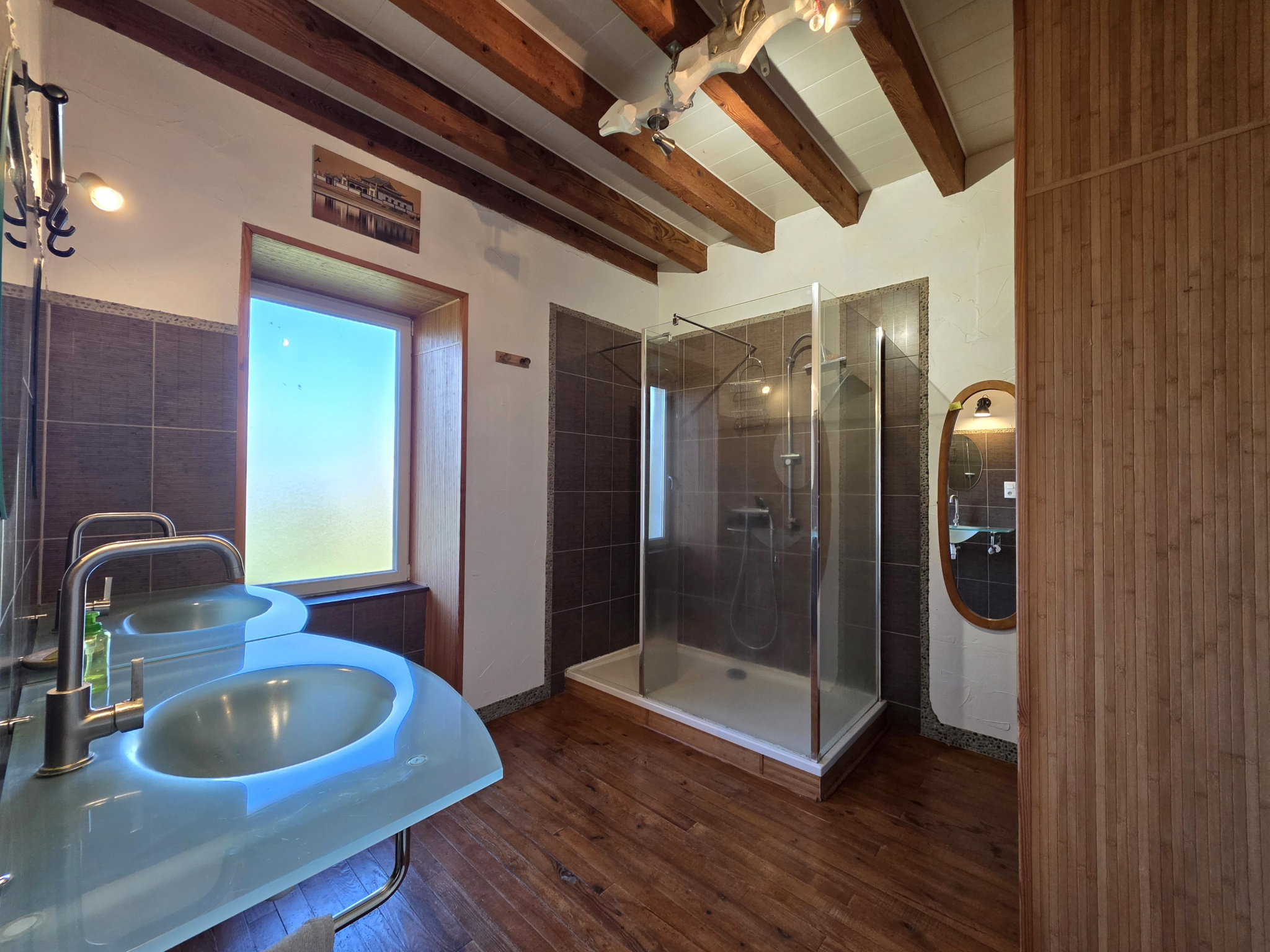 À l'étage, vous trouverez trois chambres de 12.8m2 (avec placard), 12.5m2 et 12.1m2. Un bureau, une salle d'eau avec douche, double vasque et placard ainsi qu'un WC séparé complètent ce niveau.