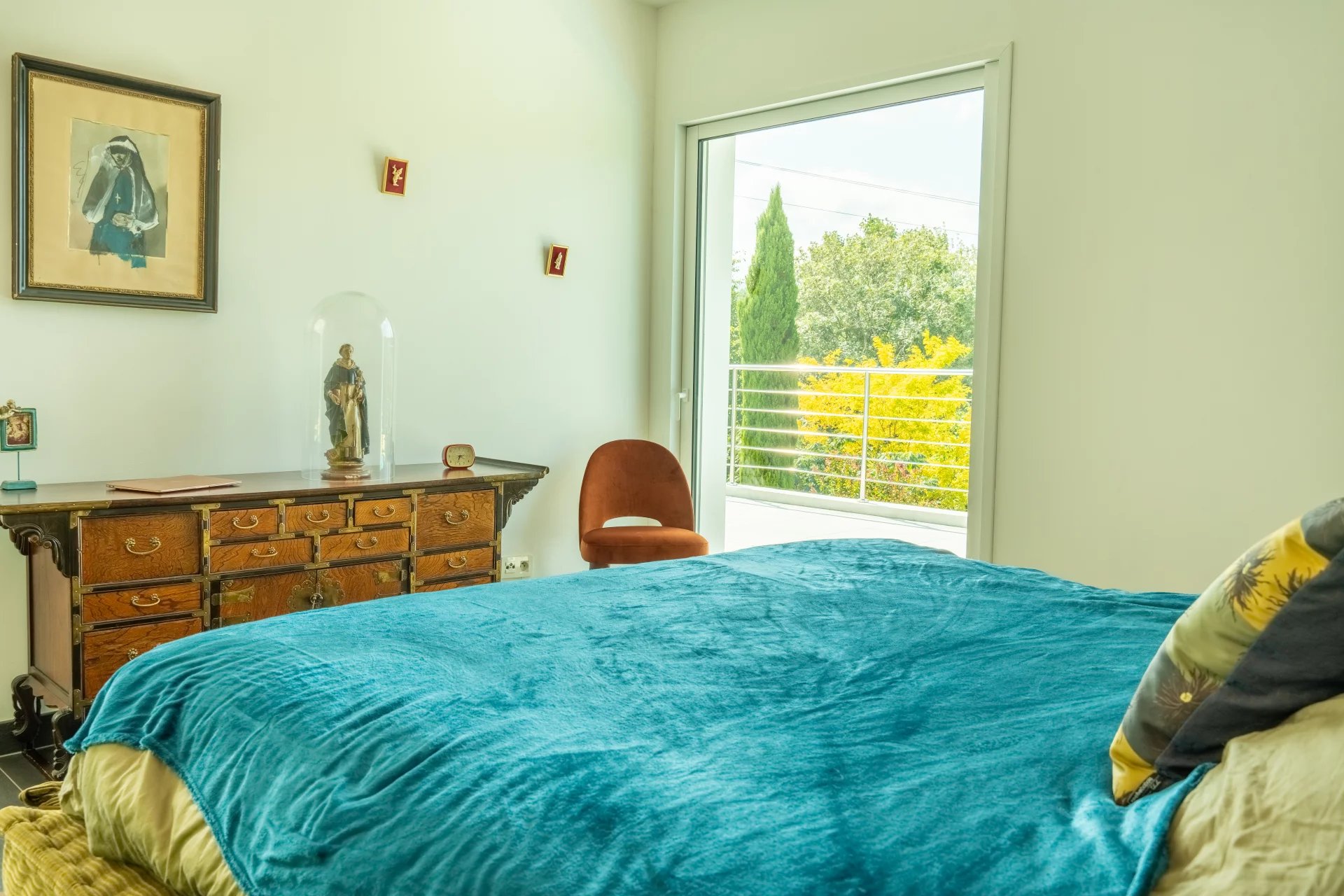 La maison bénéficie d’une luminosité exceptionnelle grâce à ses larges ouvertures en aluminium à double vitrage. Le chauffage est assuré par deux pompes à chaleur réversibles, complété par deux poêles à bois pour une atmosphère chaleureuse.