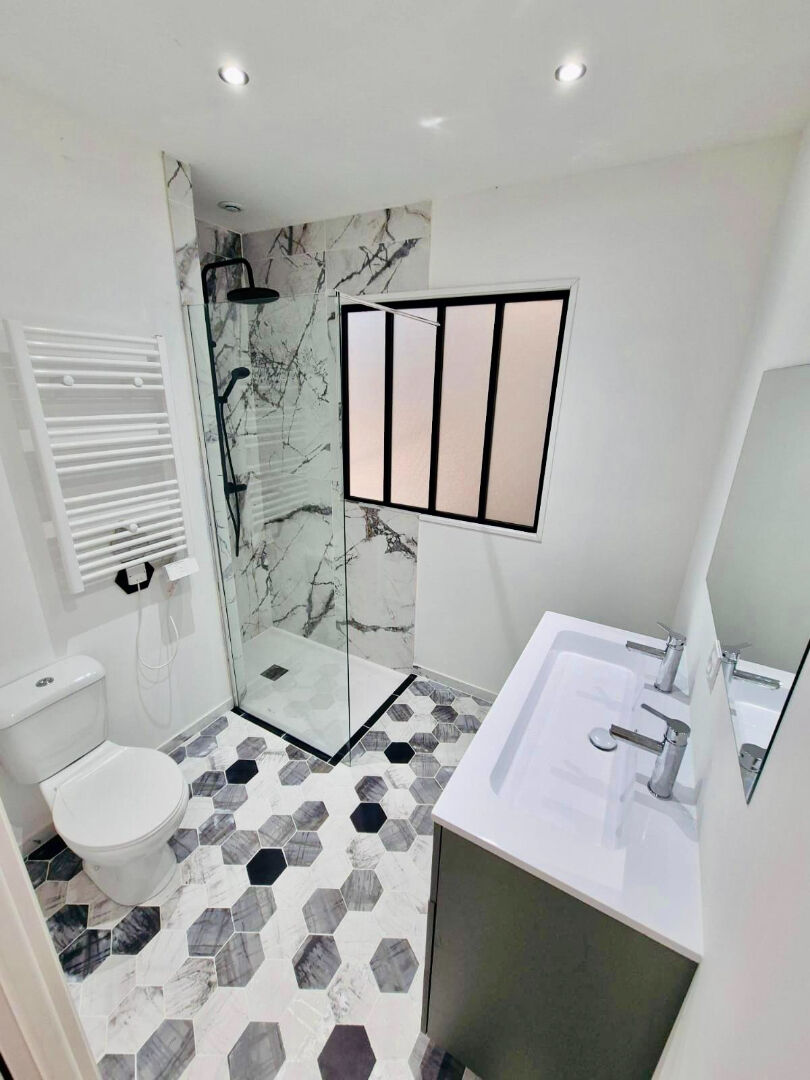 L'habitation comprend trois chambres, dont une suite parentale, offrant confort et intimité au première étage et une quatrième chambre au deuxième étage. La décoration élégante et les tapis moelleux créent une atmosphère apaisante. Les salles d'eau aux teintes audacieuses apportent une touche de modernité et d'originalité.