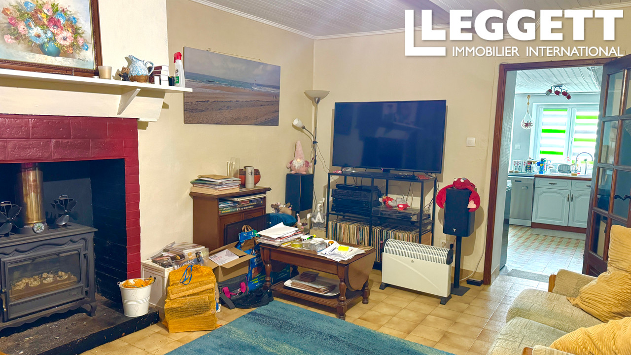 Au rez-de-chaussée : cuisine/salle à manger, salon avec cheminée équipée d'un poêle à bois, W.-C. avec évier.