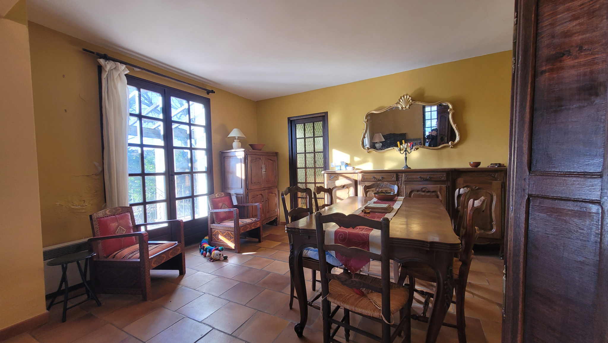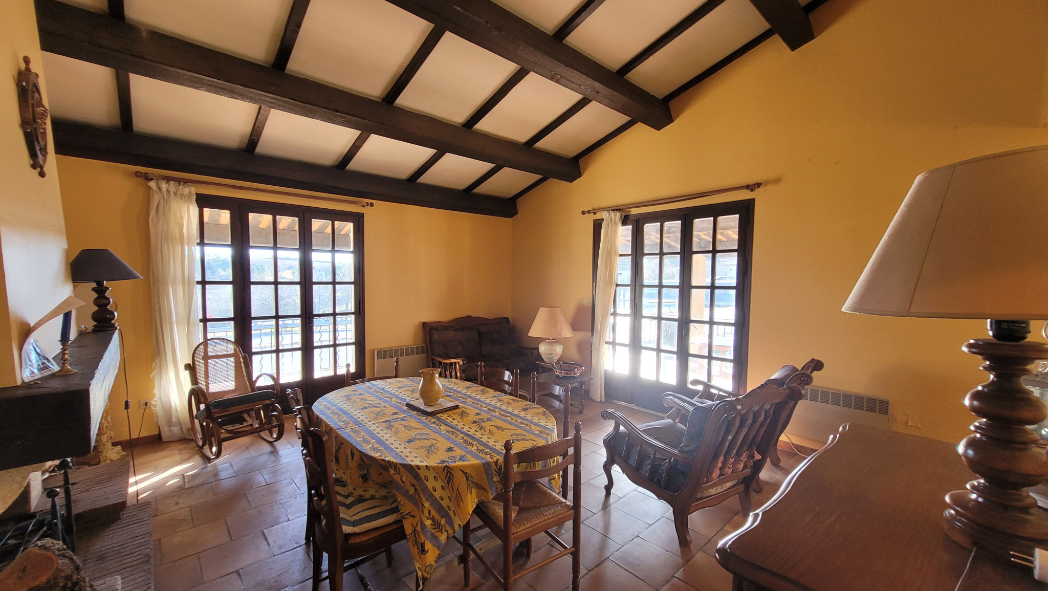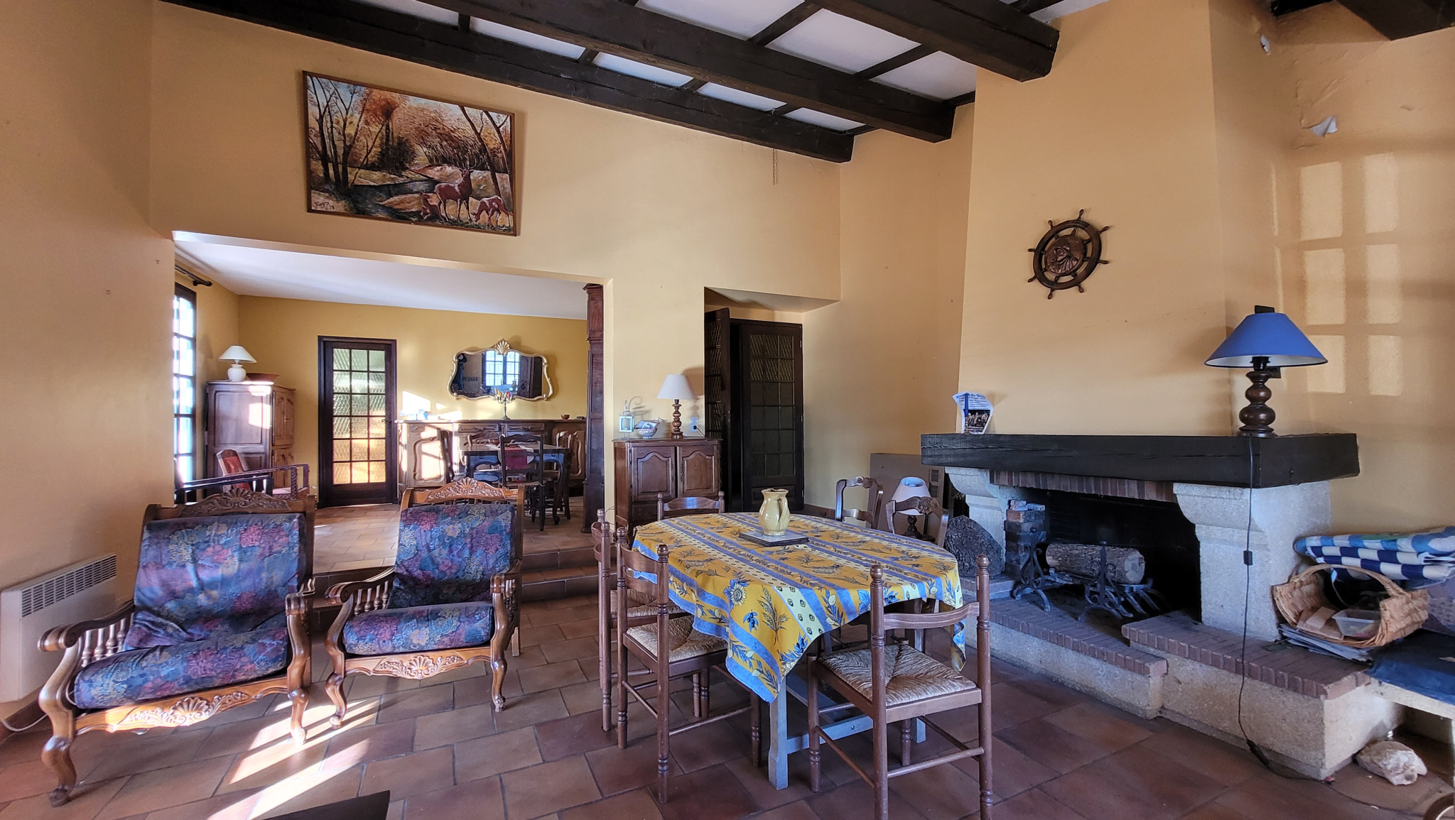 Séjour spacieux de 41 m2 équipé d'une d'une cheminée, accès à une terrasse couverte sur deux côtés