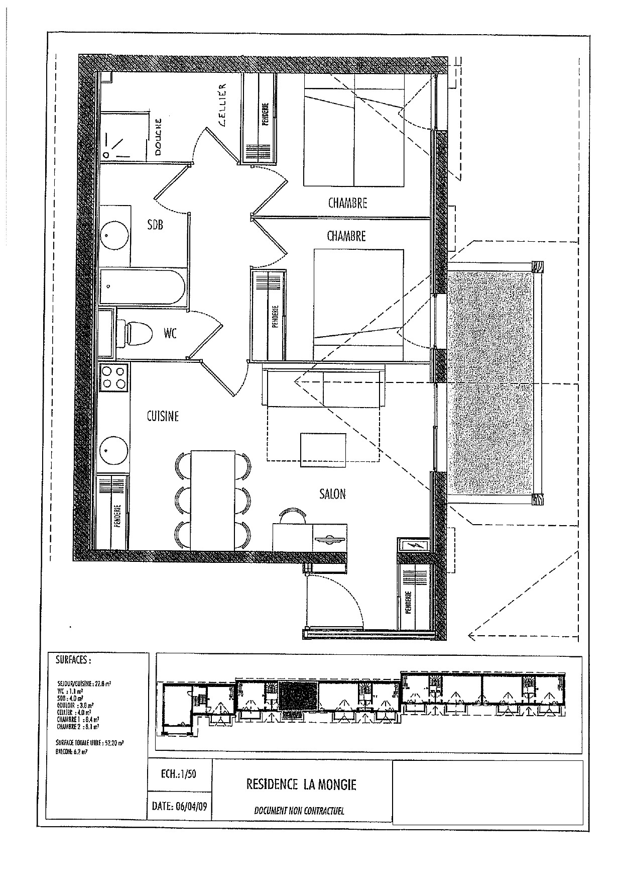 Composé d'une kitchenette ouverte sur séjour, une chambre double avec placards, une chambre dotée de deux lits simples et placards, une salle de bains et une salle de douche. Nombreux rangements et Placard privatif aménagé pour le propriétaire. Une place de parking et un casier à ski font également partie du lot.