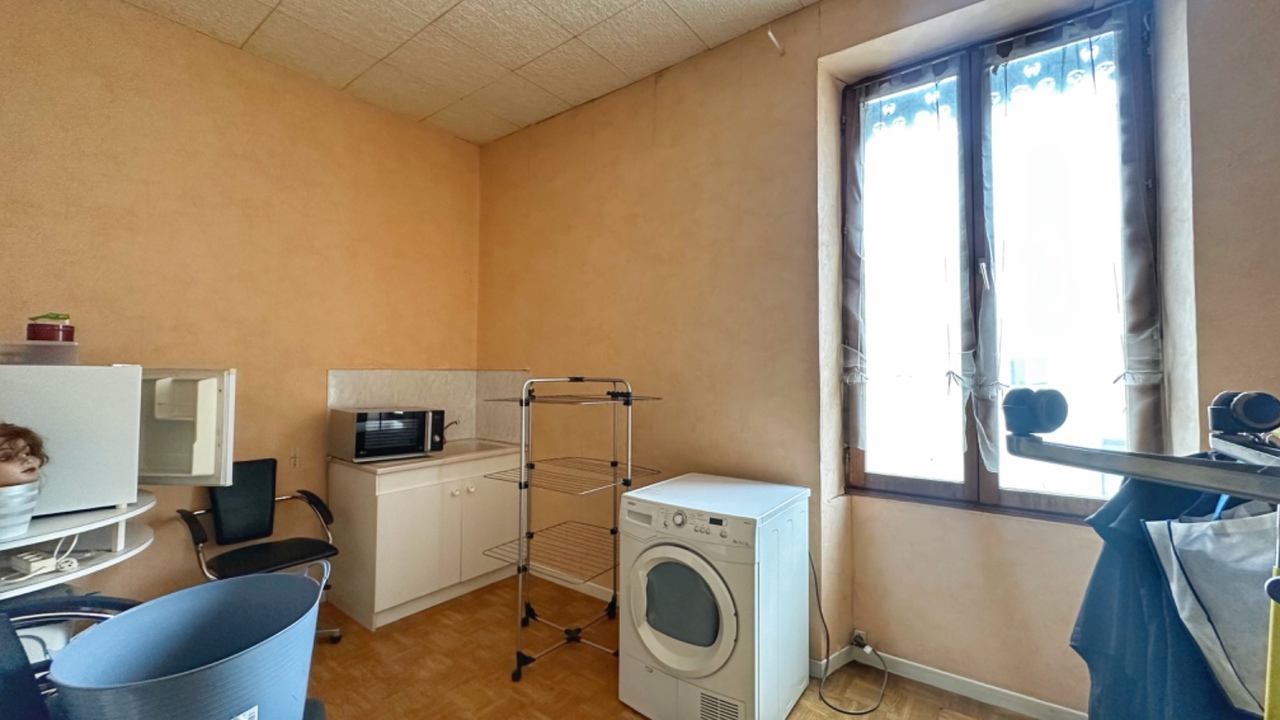 A l’étage, un couloir avec placard mural dessert une pièce de 15,10 m², une salle de repos de 10,30 m² (évier, sèche-linge) et une salle d’eau avec WC de 3,30 m².
