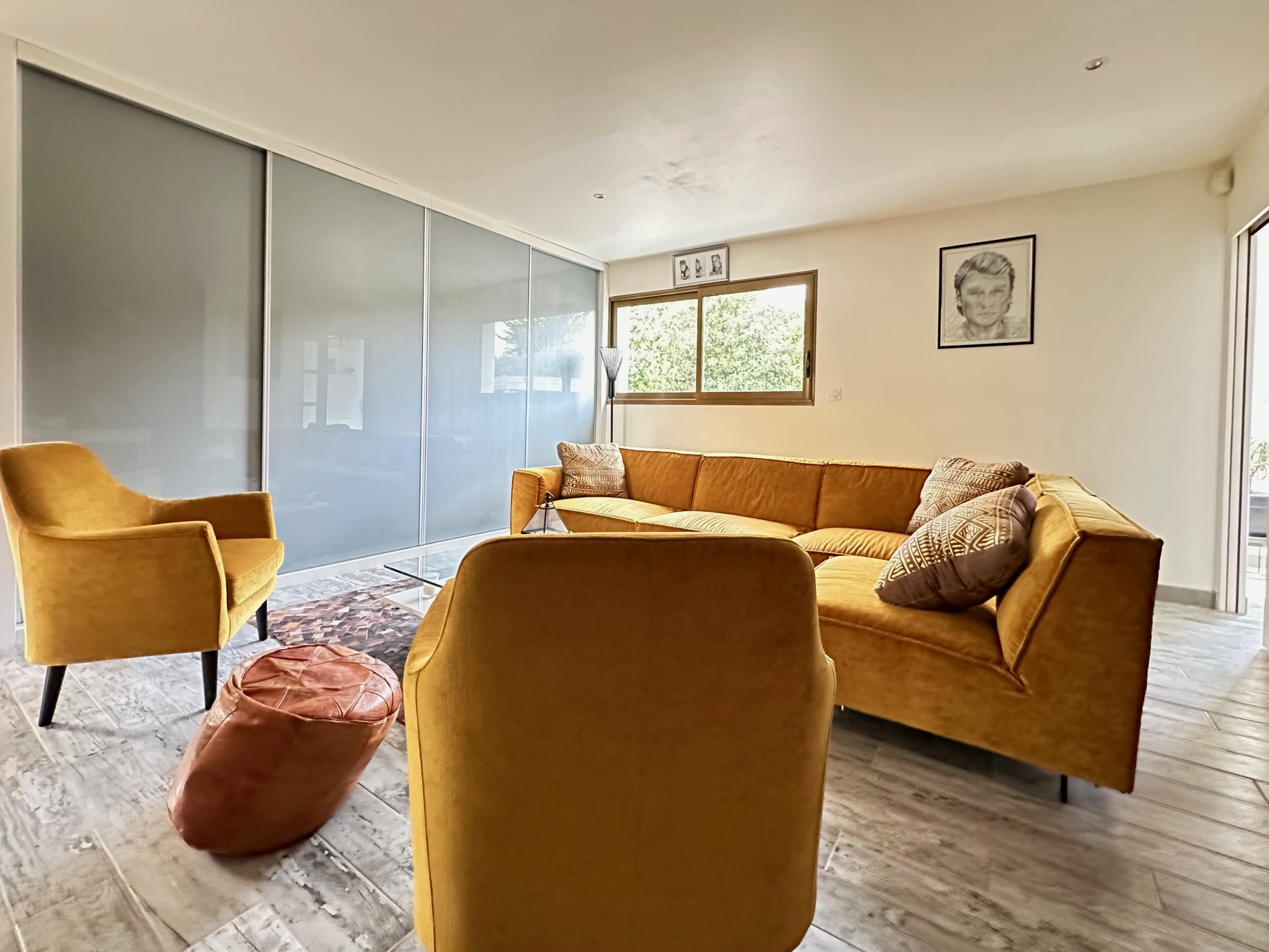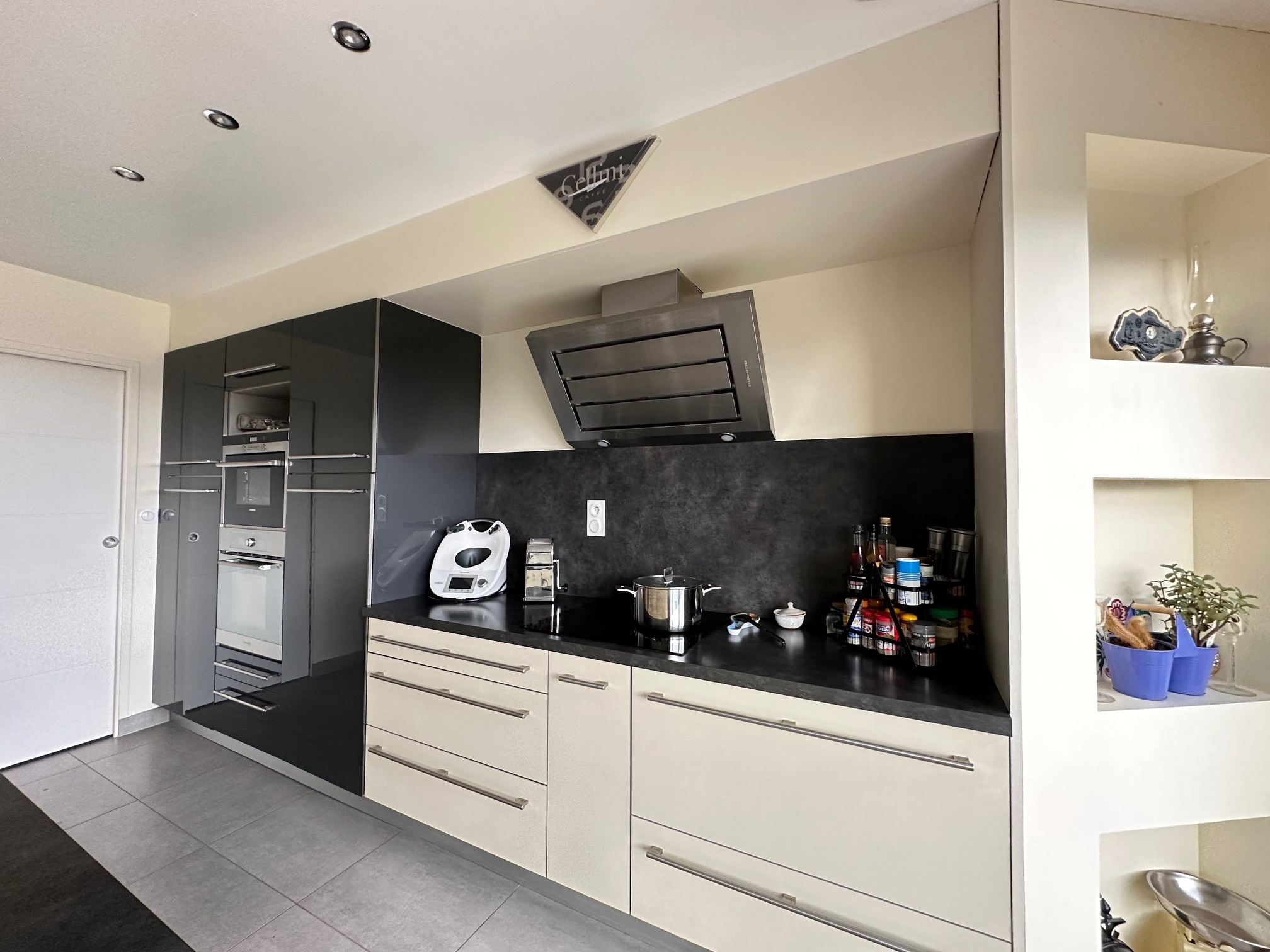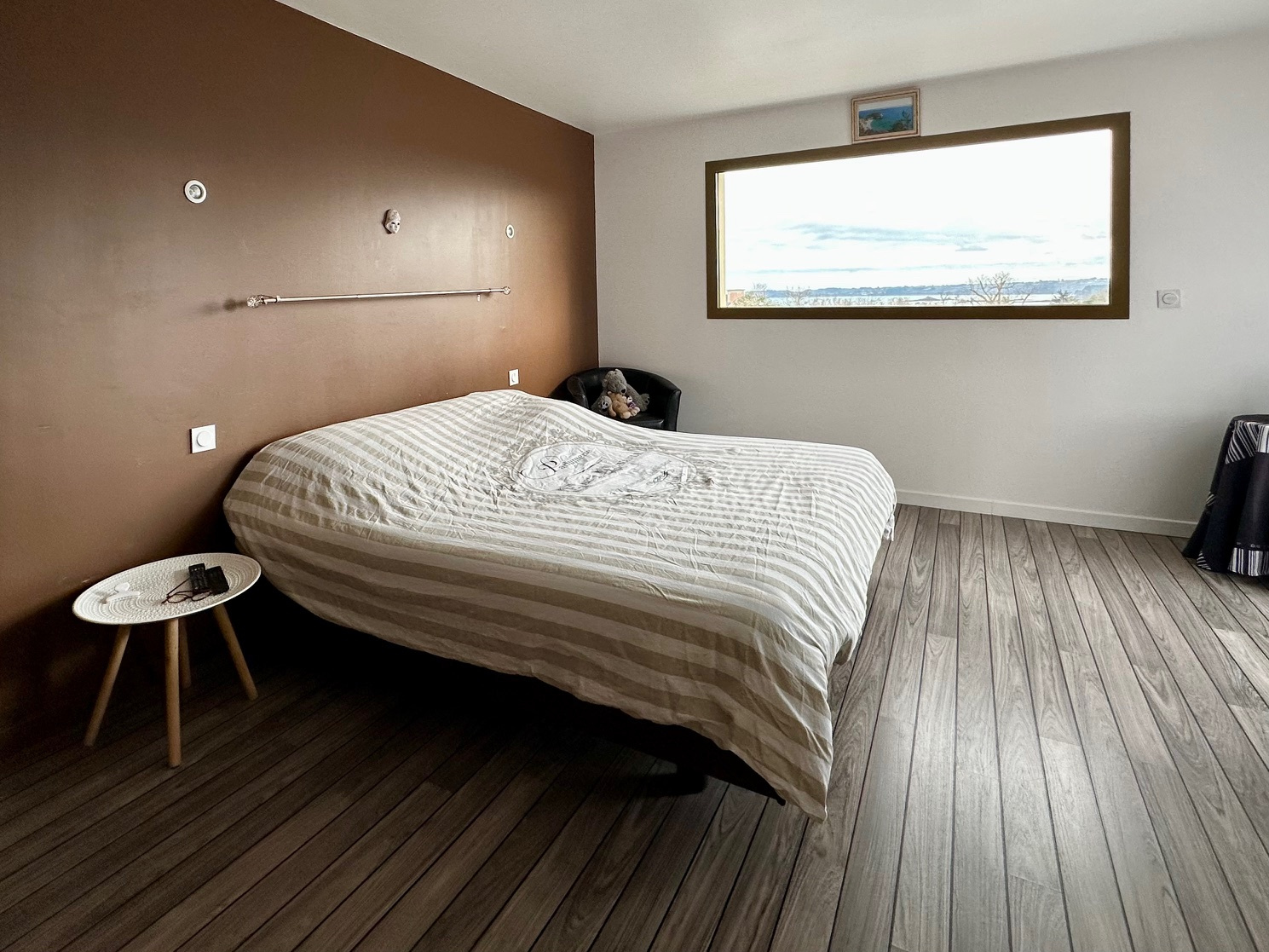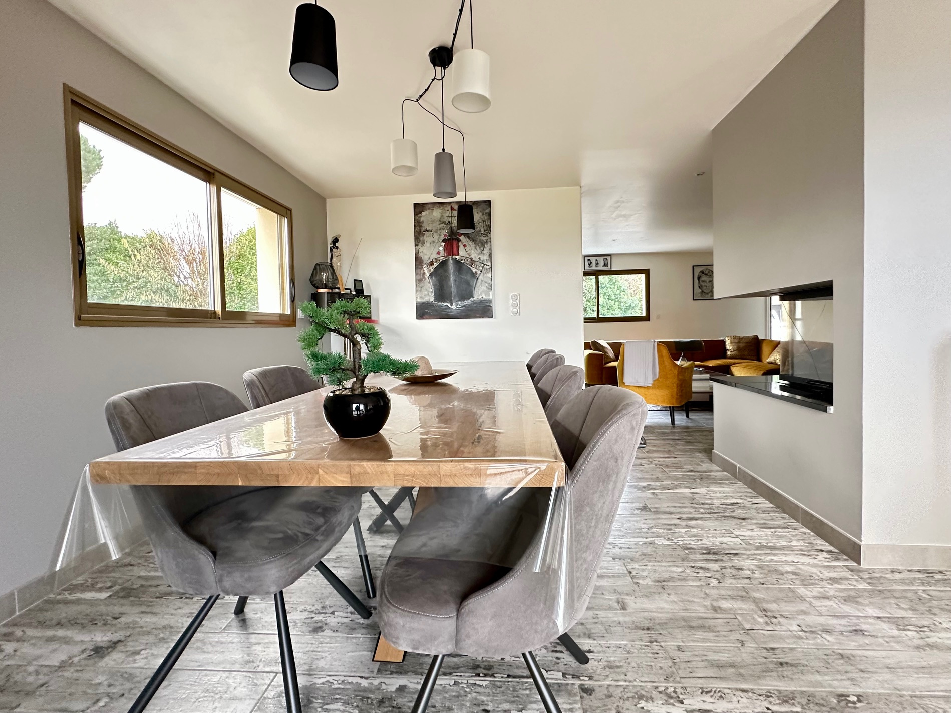 À l'intérieur, vous trouverez au rez-de-chaussée, une entrée donnant sur une pièce à vivre et sa cuisine ouverte d'une surface de près de 70 m2. Baignée de lumière grâce à ses grandes baies vitrées, vous pourrez également y profiter de moments chaleureux près de la cheminée lors des soirées d'hiver. Une grande suite parentale avec dressing et salle d'eau privative ouvrant sur une terrasse exposée sud, une buanderie et un WC viennent compléter ce niveau, vous offrant ainsi une vie de plain-pied.