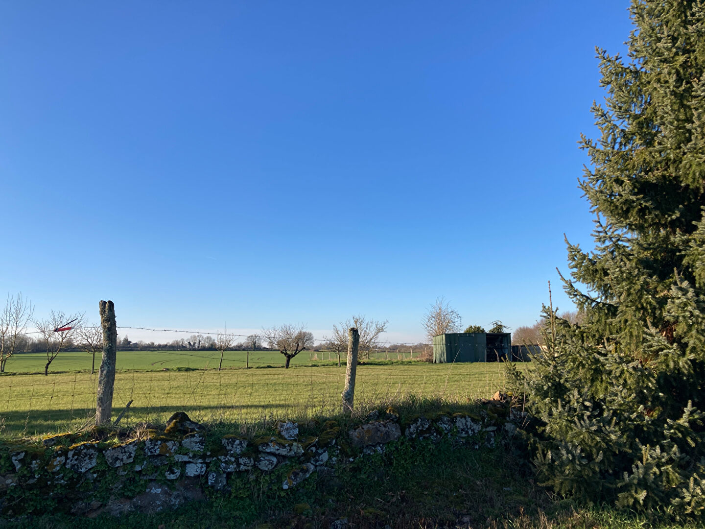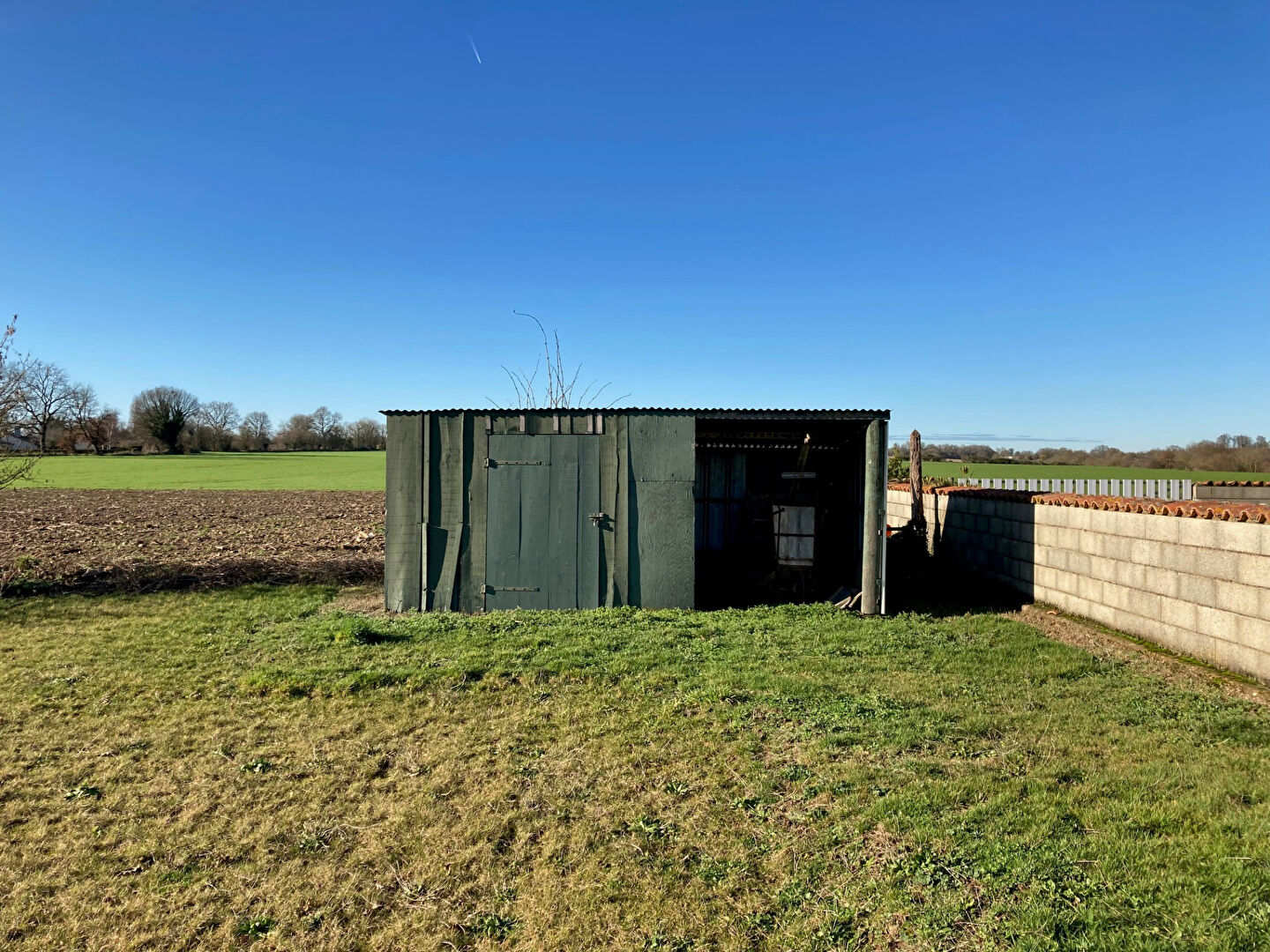 Petit cabanon (dépendance) sur le terrain et muret en bordure de voirie.