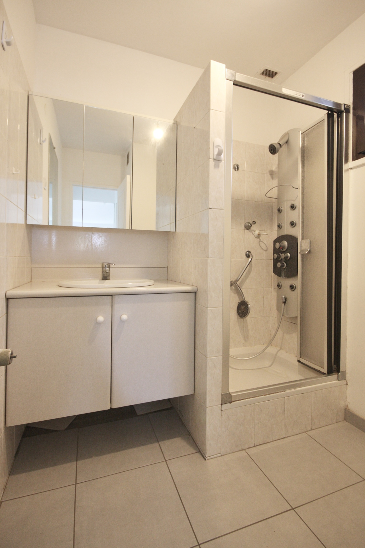 En rez-de-jardin : belle pièce palière, 2 chambres avec baies vitrées donnant sur jardin, salle d'eau avec WC, chaufferie.