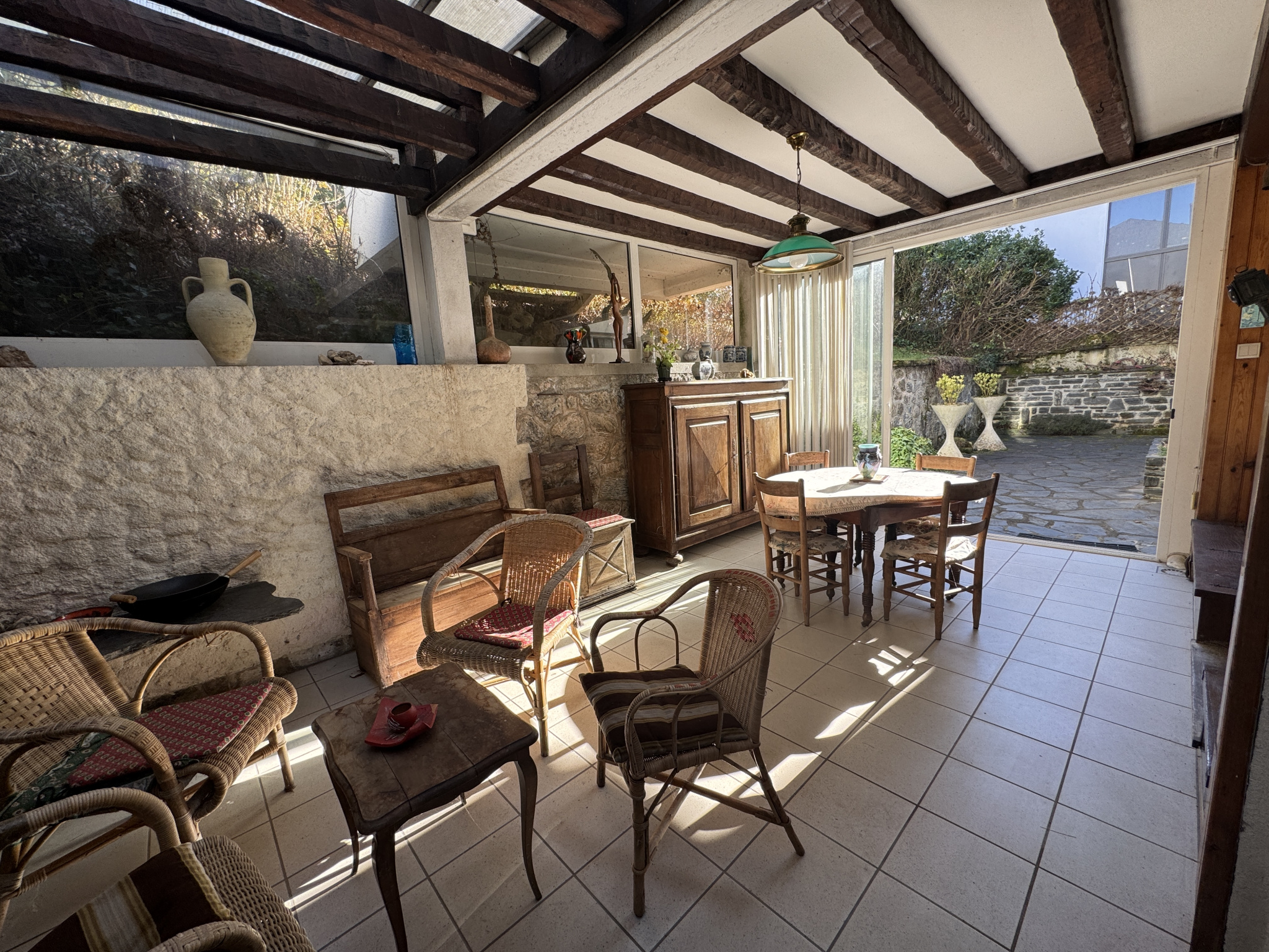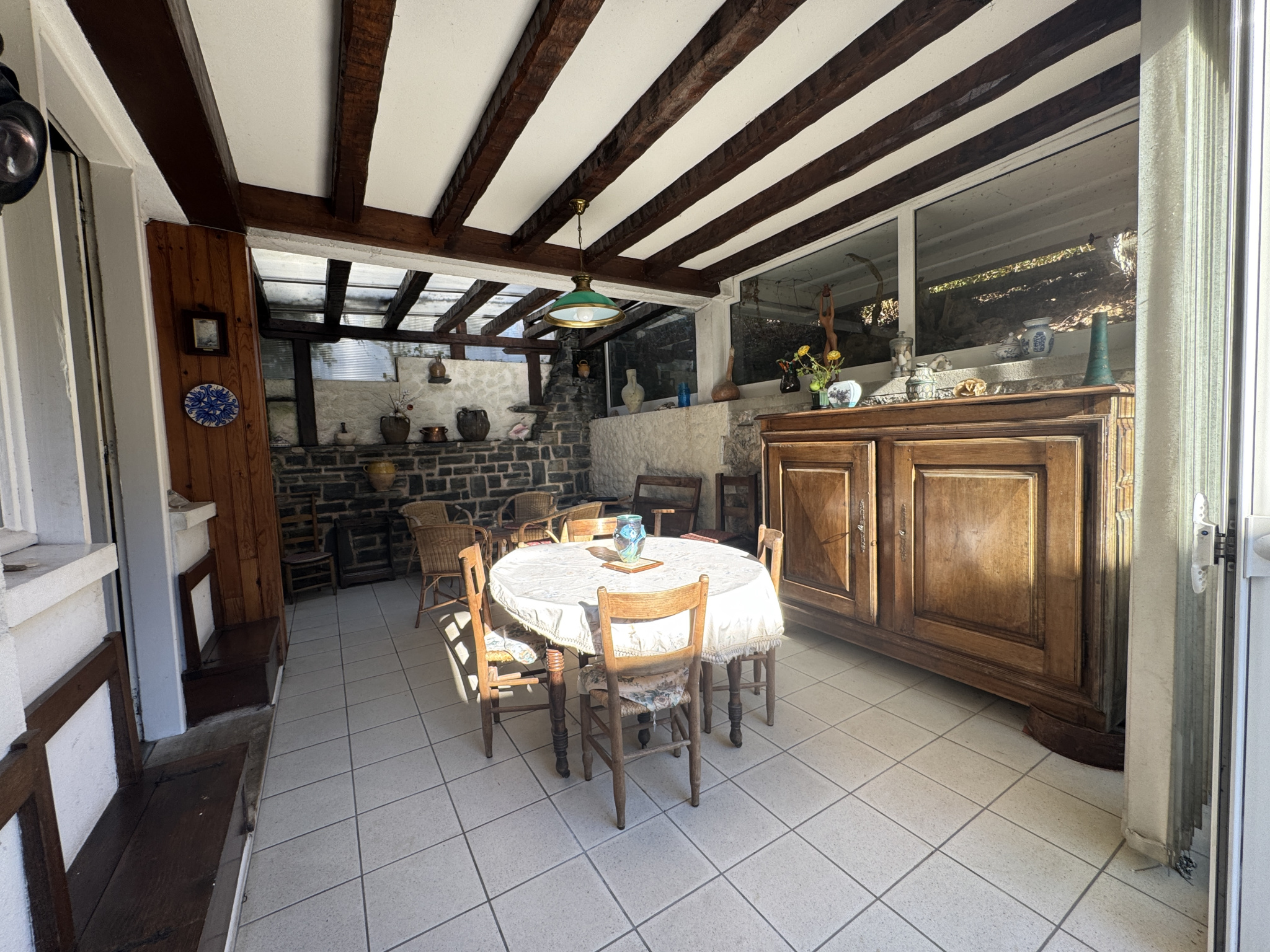Elle se compose d'une entrée, un WC, un séjour, une cuisine sur véranda chauffée et une seconde véranda donnant accès aux terrasses de part et d'autre de l'habitation. L 'étage offre deux chambres, un bureau, une salle de bains, un WC et une chambre avec cabinet de toilette.
