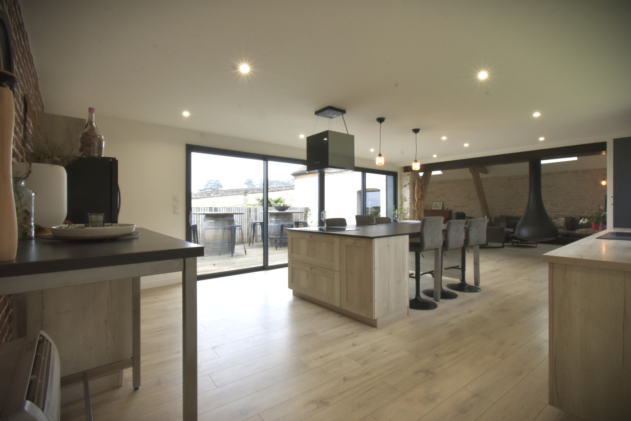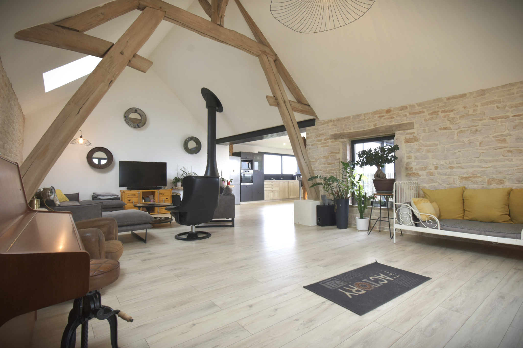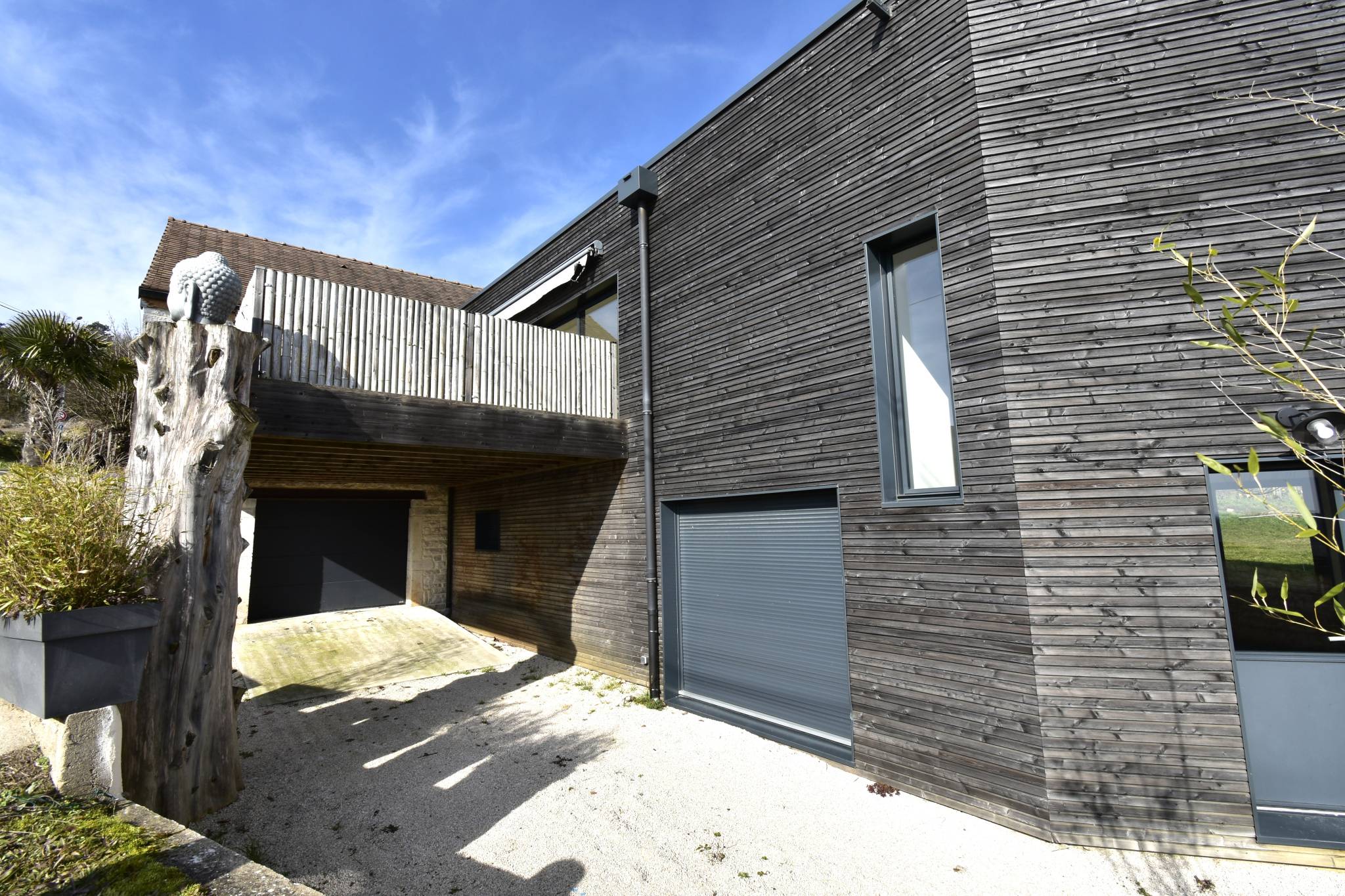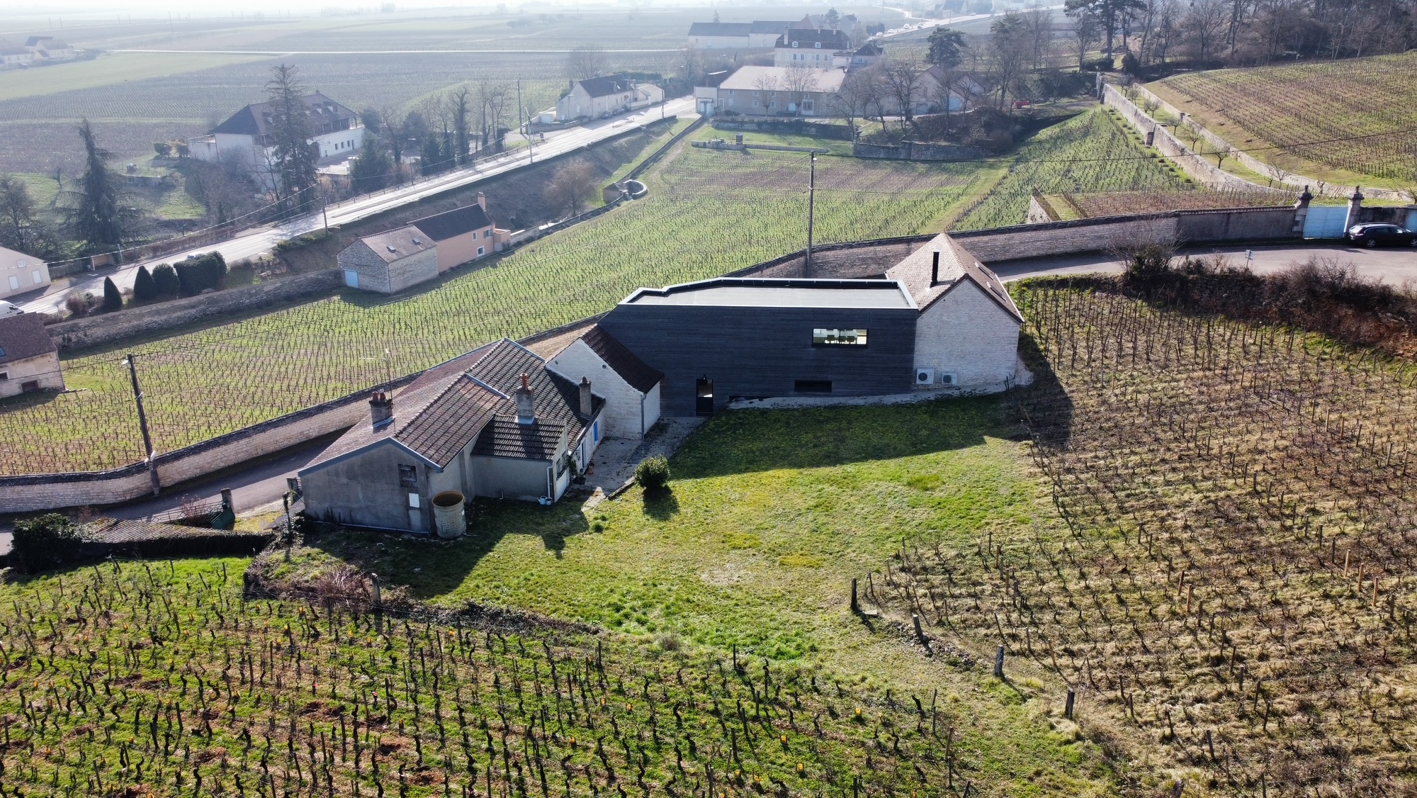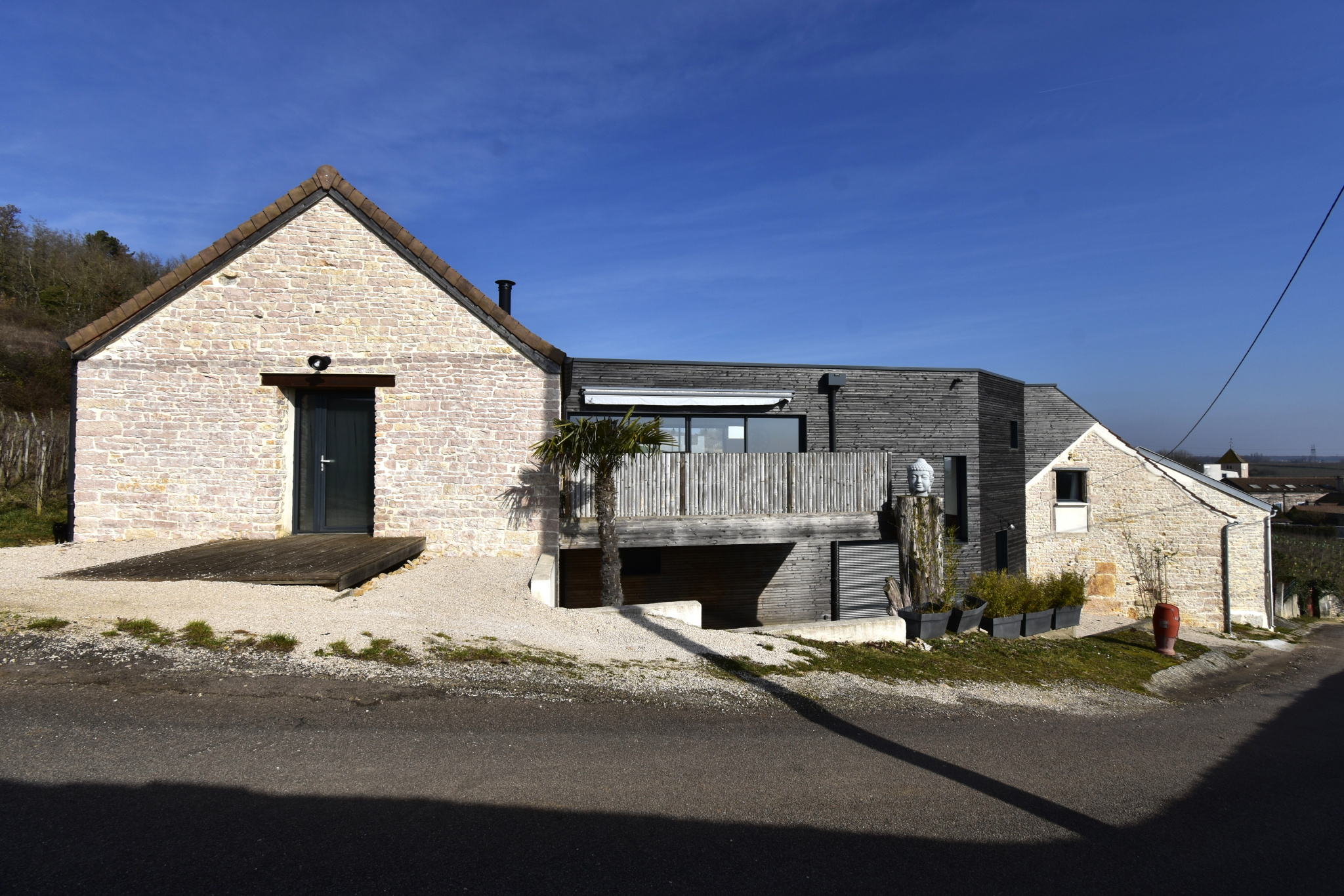 11473 - Côtes de Nuits. Au coeur des vignes. Maison d'architecte d'environ 265 m2 habitables, unique dans sa conception avec de beaux volumes. Deux corps de bâtiments anciens conservés avec pierres, poutres apparentes et extension bois. Elle se compose de salon/séjour avec cheminée suspendue ouverte sur la cuisine aménagée et entièrement équipée donnant sur belle terrasse, arrière-cuisine, toilettes, une chambre avec meuble vasque et douche. Au niveau inférieur, hall d'entrée avec accès sur le jardin, une belle chambre avec pierres et poutres apparentes, une suite parentale d'environ 46 m2 climatisée avec douche italienne et baignoire. Une autre chambre indépendante avec dressing, salle de douches et toilettes. Caves, trois garages. Une deuxième maison attenante à exploiter d'environ 60 m2. Possibilité d'acquérir une parcelle de vignes Premier Cru. Bien unique !!! A découvrir !!!