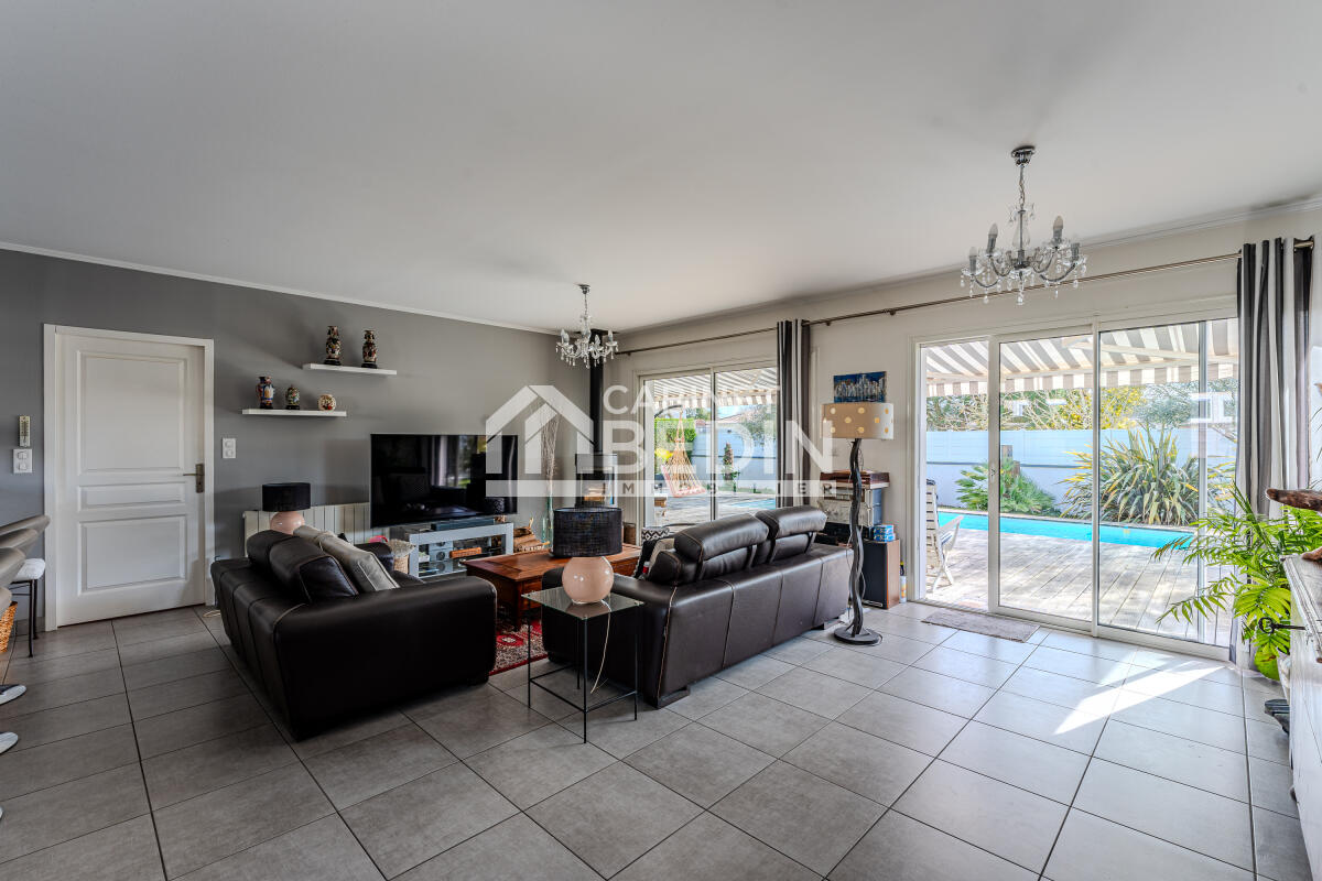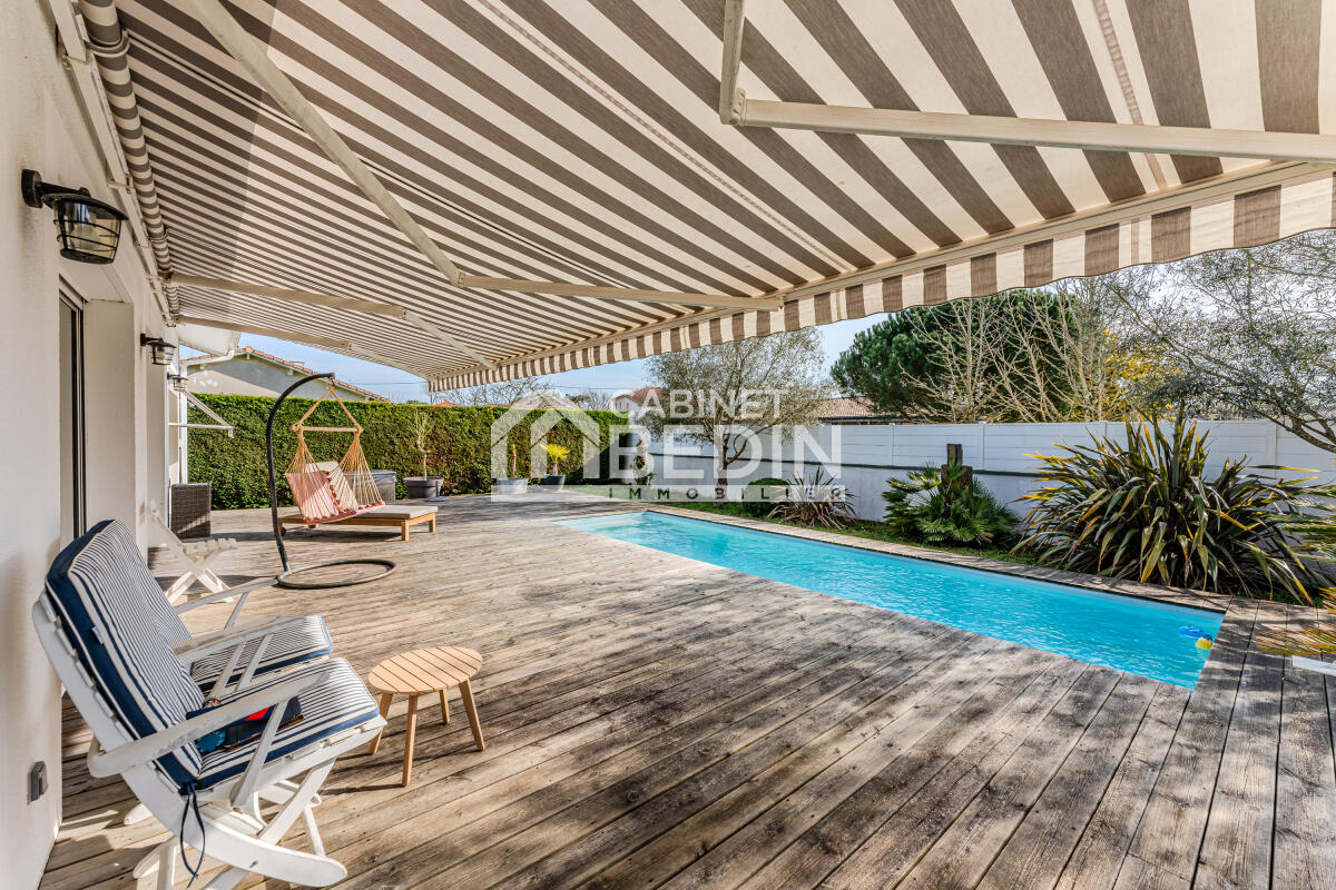 GUJAN - LA HUME. Exclusivité Cabinet Bedin Immobilier. Située dans le quartier de la Hume au coeur d'un environnement calme, venez découvrir cette maison contemporaine de 2010 implantée sur une parcelle de plus de 600 m². L'habitation se développe de plain pied sur 171 m² habitables et propose un agencement fonctionnel et confortable dans l'esprit Longère avec un hall d'entrée à l'OUEST distribuant cellier et buanderie ainsi qu'un dégagement avec 2 chambres, salle de bains/douche et WC indépendant. La pièce de vie est centrale et traversante, elle offre un volume de 60 m² avec cuisine américaine et poêle à bois côté salon pour agrémenter les soirées d'Hiver. A l'EST, un espace parental de 46 m² regroupant 2 chambres ou chambre et bureau, dressing et salle de bains/douche avec WC. L'ensemble des pièces offre une très belle luminosité grâce aux 5 baies vitrées exposées plein SUD avec dégagement vers la terrasse et le jardin paysager avec piscine. Proche des commodités. Vous n'avez plus qu'à poser vos valises !