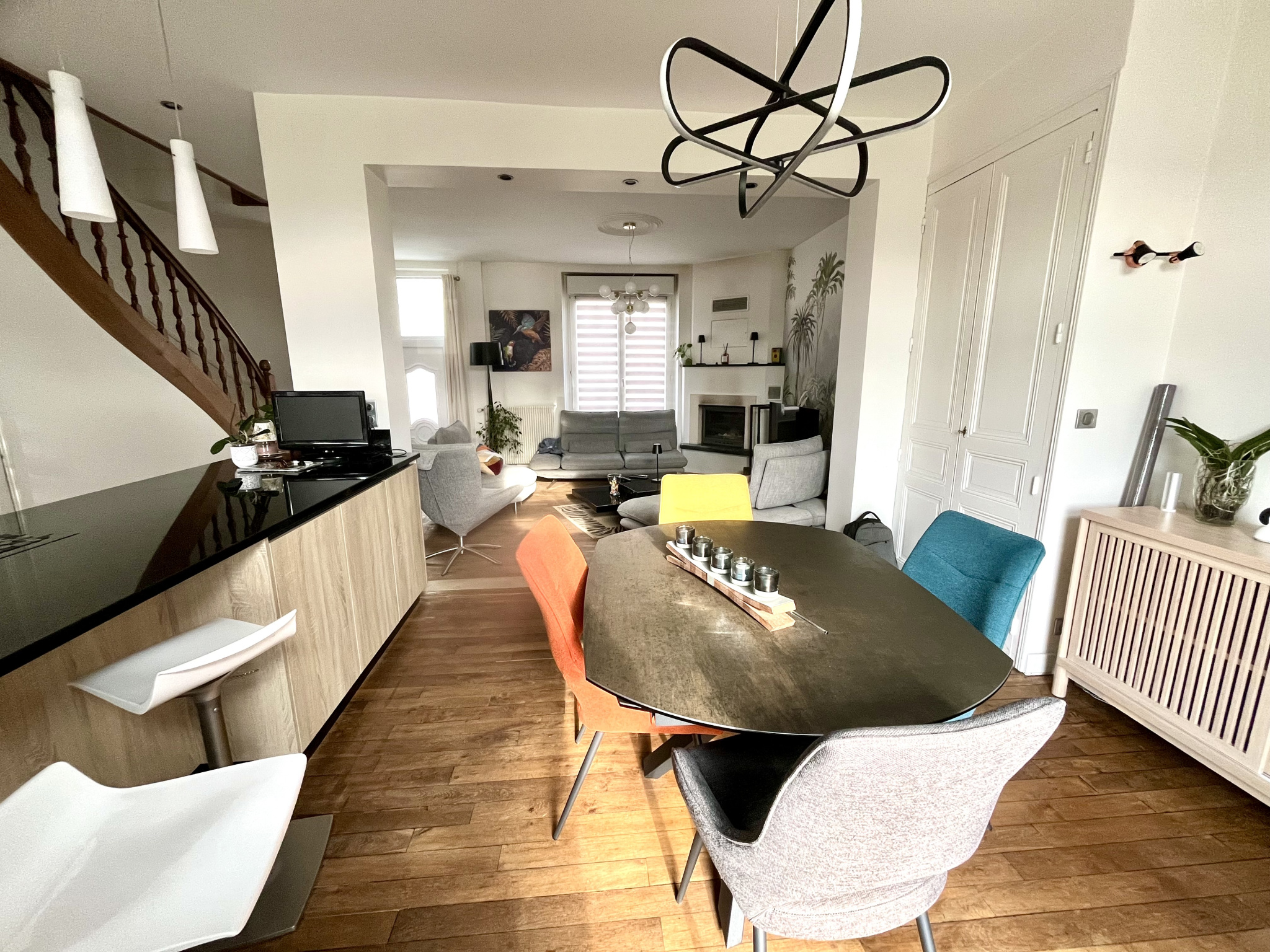 - Au rez-de-chaussée, une spacieuse pièce de vie de plus de 40 m2 agrémentée d'une cheminée, intégrant une cuisine moderne entièrement équipée. Cet espace convivial s'ouvre sur un agréable jardin clos, arboré et au calme. Un WC complète ce niveau.