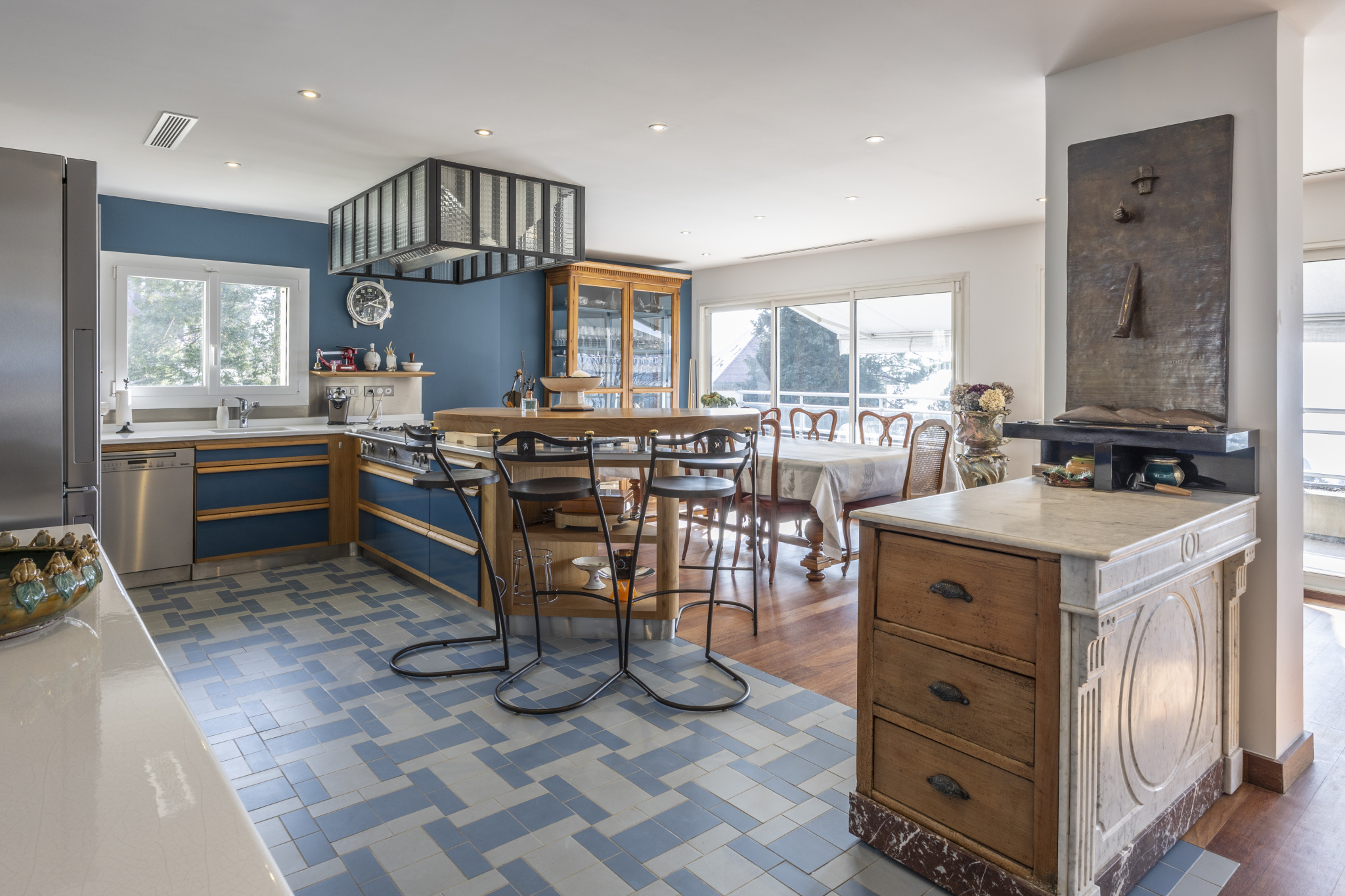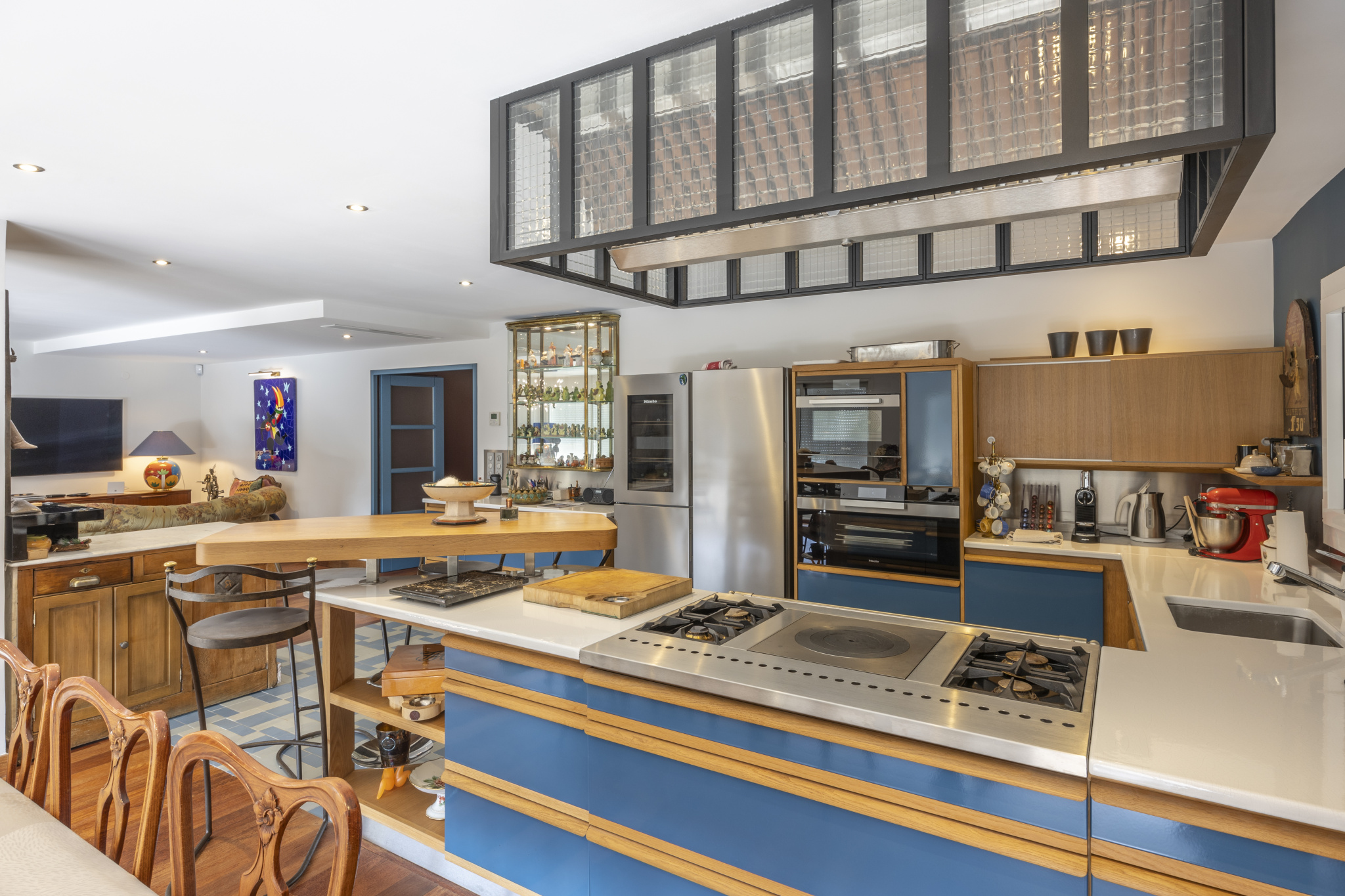 Véritable joyau pour les passionnés de gastronomie, la cuisine a été conçue comme une oeuvre d'art fonctionnelle. Réalisée sur mesure par des maisons renommées, elle allie l'excellence des équipements professionnels au charme des matériaux nobles. Son majestueux piano de cuisson signé La Cornue trône au coeur de cet espace dédié aux plaisirs culinaires, accompagné de plans de travail en lave émaillée et d'une table façonnée à partir de douelles de cuves de Bourgogne, témoignant d'un artisanat d'exception. Chaque détail a été minutieusement pensé pour sublimer les instants de partage, entre convivialité et raffinement.