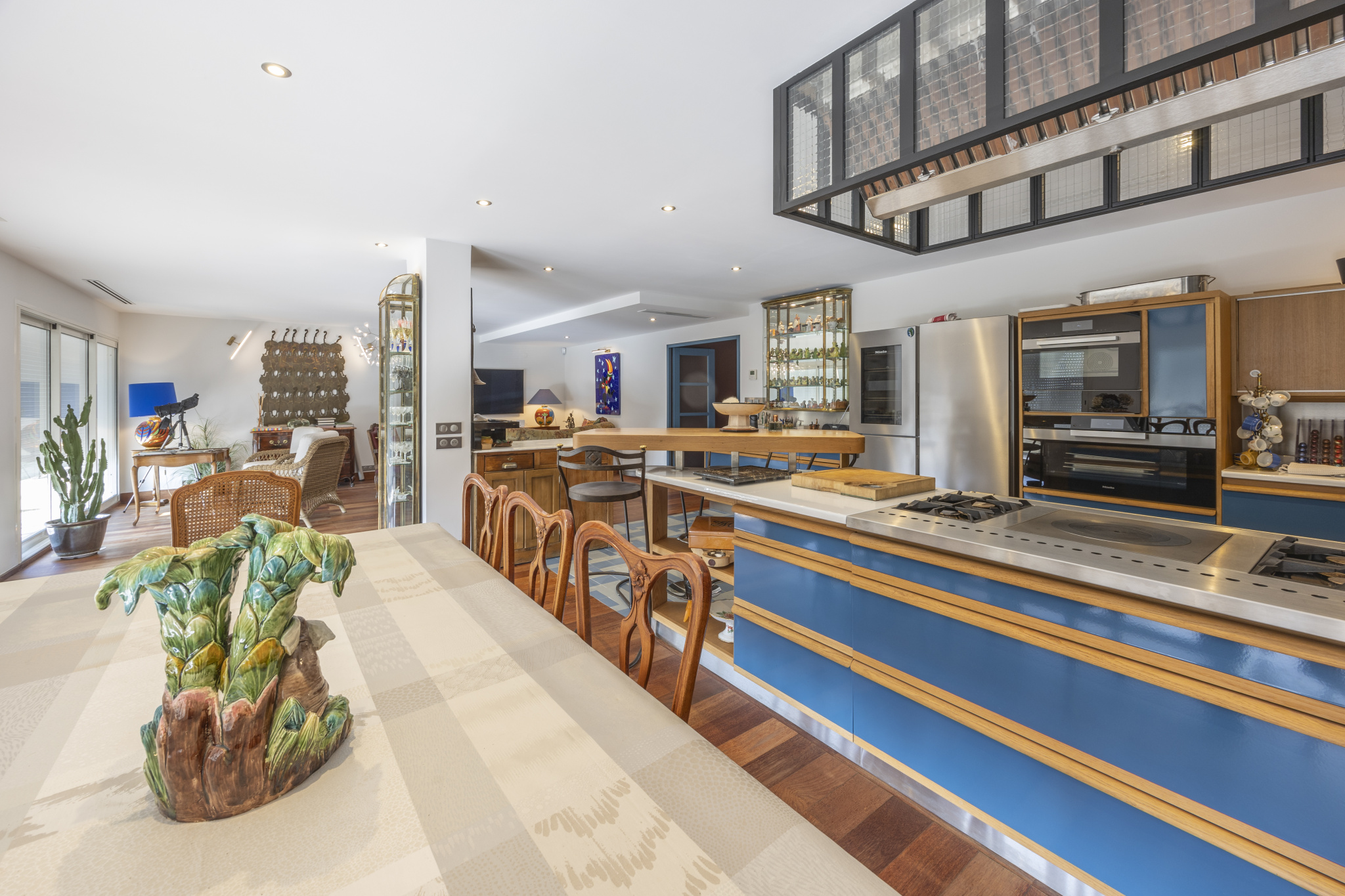 A true gem for gastronomy enthusiasts, the kitchen has been conceived as a functional work of art. Custom-designed by renowned artisans, it combines professional-grade equipment with the charm of noble materials. At its heart stands a majestic La Cornue range, accompanied by enamelled lava stone countertops and a dining table crafted from reclaimed Burgundy wine barrel staves--an exceptional testament to fine craftsmanship. Every detail has been meticulously thought out to enhance moments of sharing, balancing conviviality and sophistication.