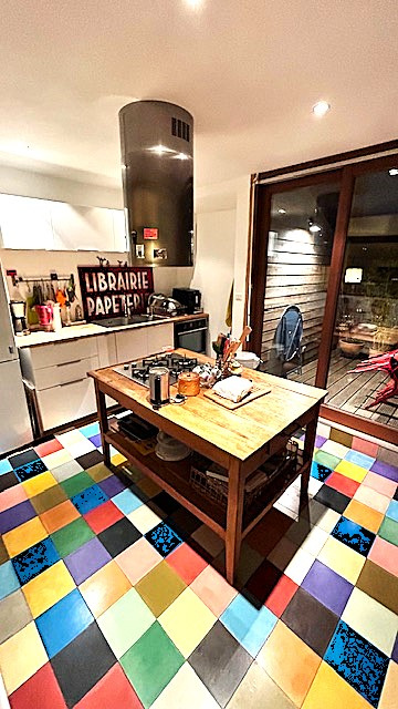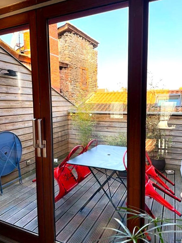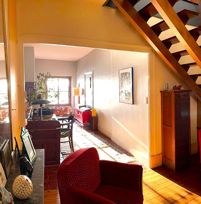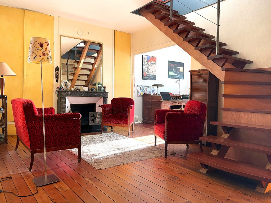 - En duplex au dessus : accès par bel escalier intérieur sur vaste pièce de vie à usage de salon/salle-à-manger et cuisine aménagée et équipée offrant accès sur très belle terrasse exposée 'ouest', dégagement, WC no2, rangements.