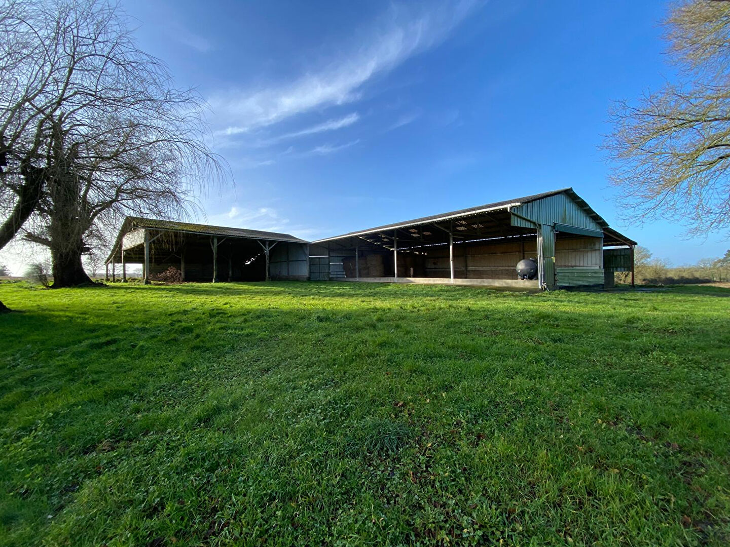 3-Deux grands hangars agricoles : une ancienne stabulation avec un sol bétonné d'environ 435m2 et un ensemble de 2 hangars accolés avec un sol en terre d'environ 620m2.