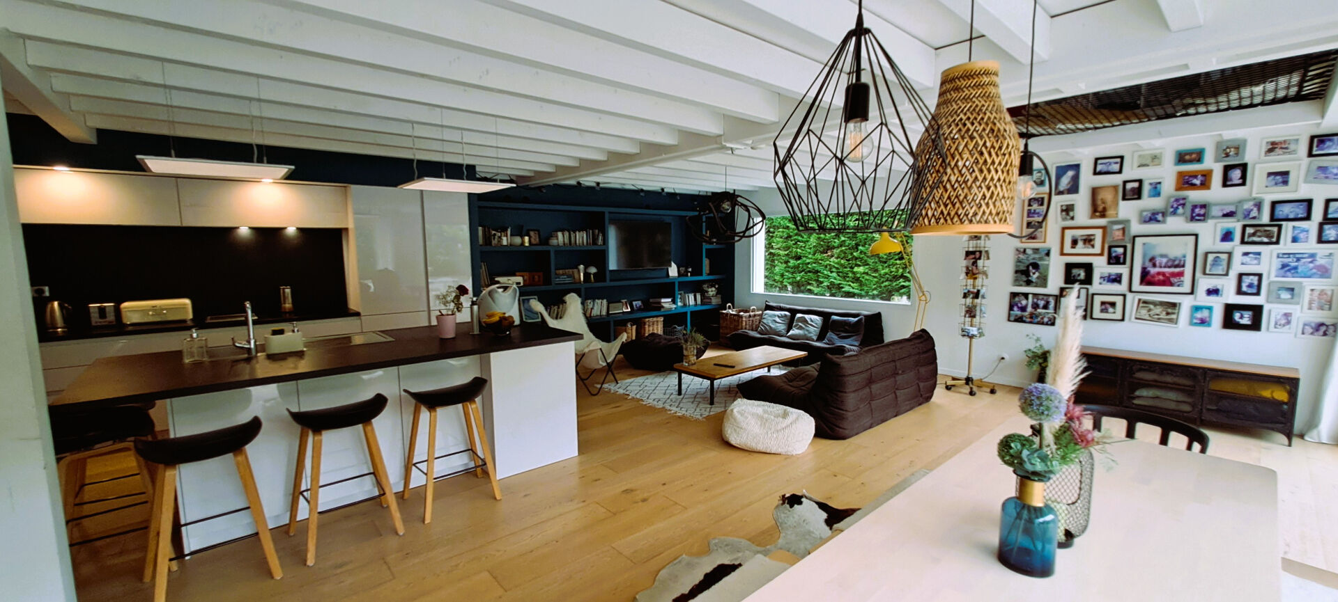 Cette vaste et chaleureuse maison est le fruit du mix réussi entre la rénovation d'une maison préexistante et la création d'un espace contemporain en extension.