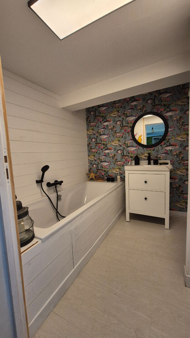 Au 1er étage : une première partie nuit avec grande chambre et sa salle de bains avec WC, un espace grenier (possibilité dressing).