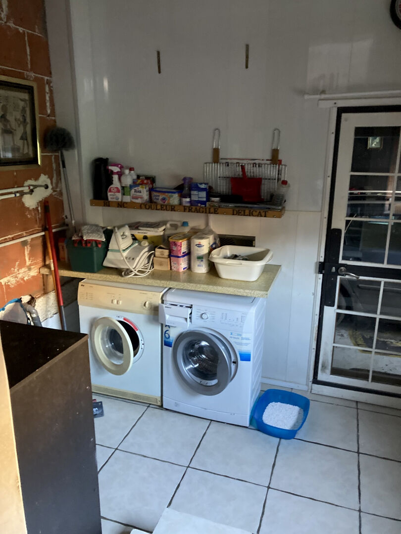 Maison mitoyenne comprenant une pièce de vie avec cuisine équipée ouverte sur séjour, salle d'eau et buanderie en RDC. A l'étage: 2 chambres avec grands placards chacune. Une 3e chambre mansardée au 2e étage. Grand garage et terrain avec abri de jardin.