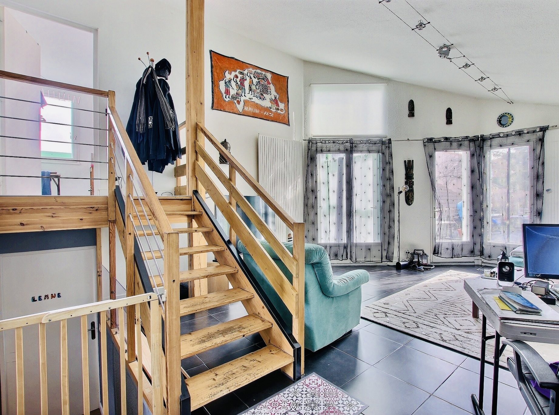 A l'entresol on découvre deux chambres, une salle d'eau et WC et à l'étage deux autres chambres, une salle de bains.