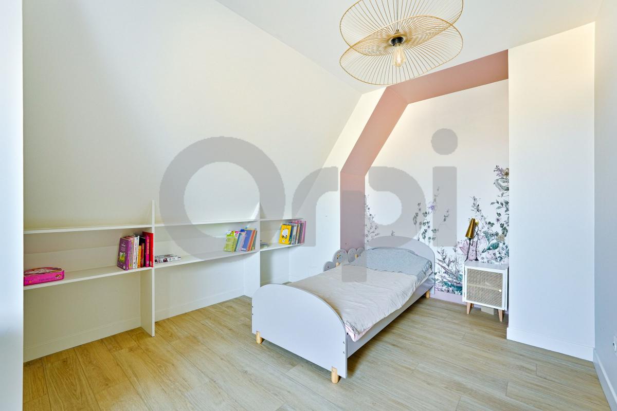 À l'étage, l'espace nuit se compose d'une suite parentale avec salle d'eau, de deux chambres avec placards, d'une salle de bains et de WC indépendants à chaque niveau.