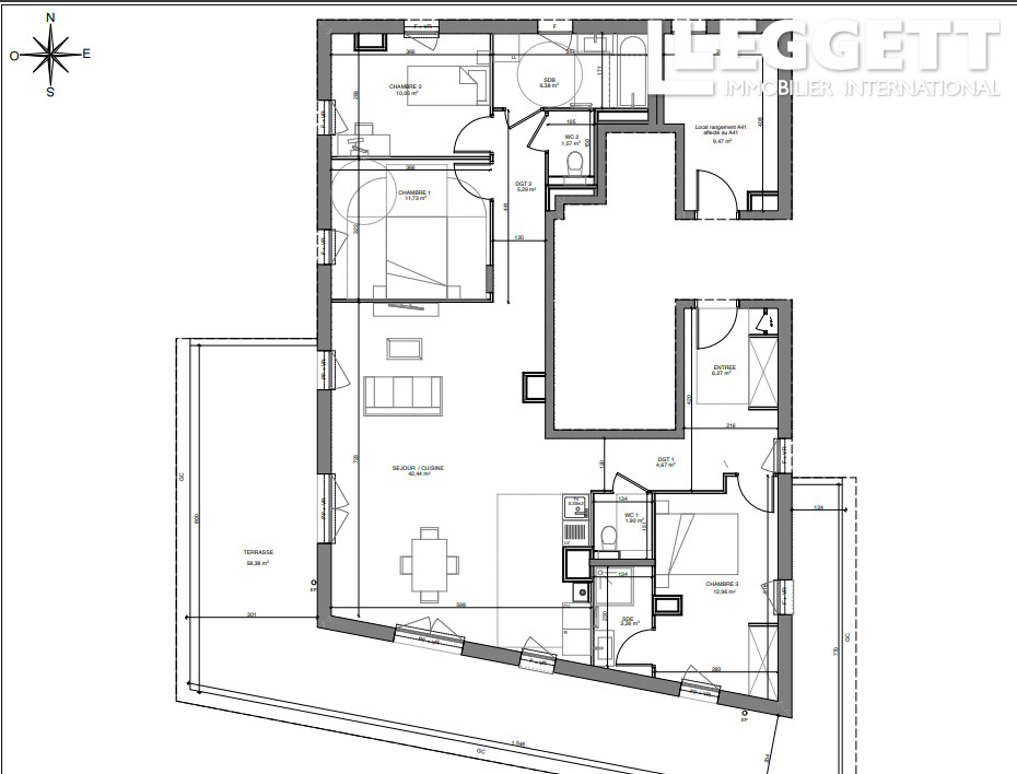 Entrée 6,27m2 ; Salle de bain 6,38 m2 ; salle de douche 3,26m2 ; WC 3,47m2 ; débarras 9,96 m2 ; première chambre 11,73m2 ; deuxième chambre 10,06m2 ; troisième chambre 12,9 m2 ; salon + cuisine 42,44m2.