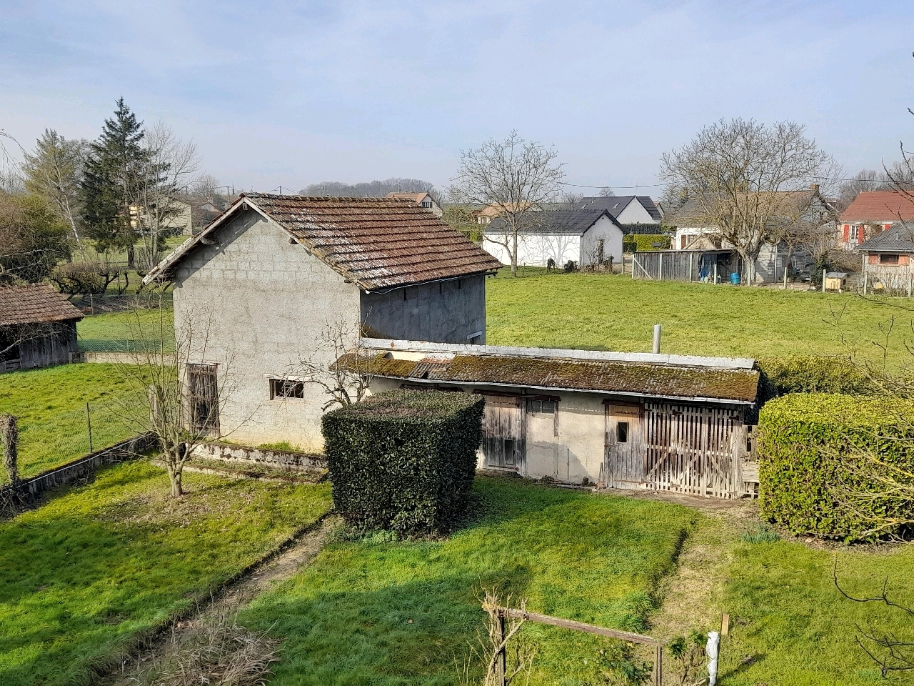 Elle possède également des dépendances dont une ancienne étable (38 m²), des poulaillers, une ancienne volière, un grand bâtiment (147 m²) et un terrain d?agrément de 4548 m².