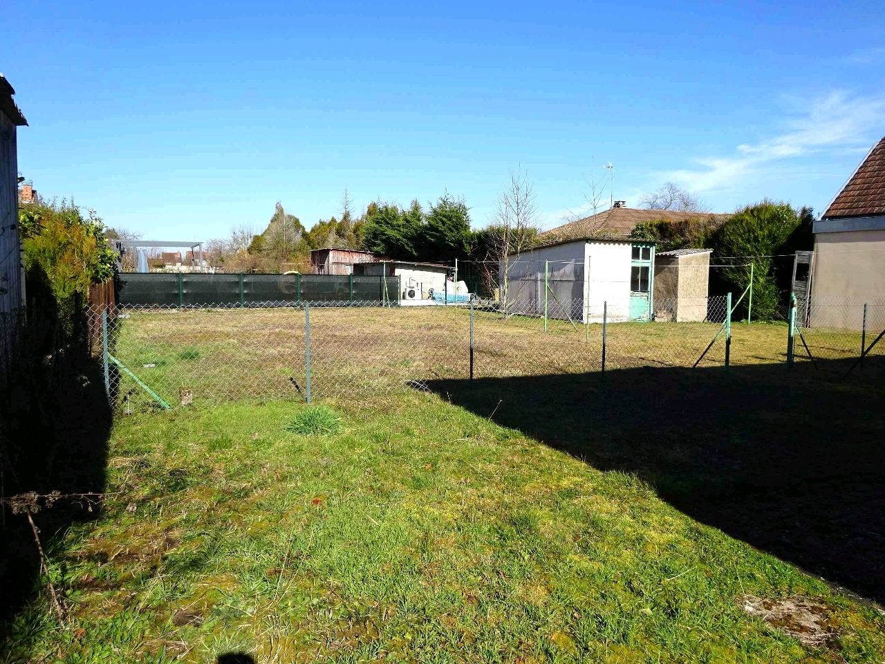 Terrain clos de 771m² avec jardin en herbe et cabanons.