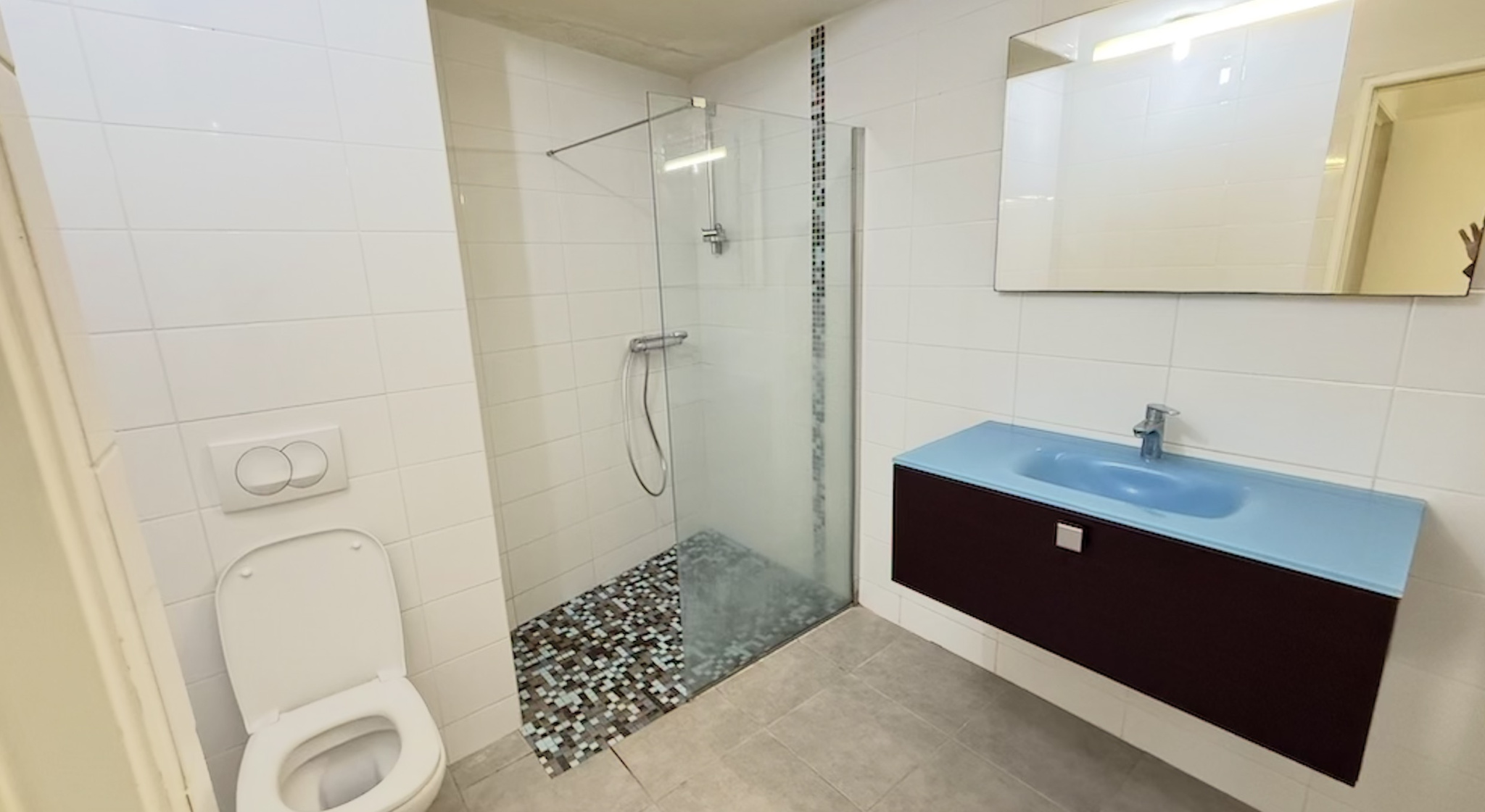 L'appartement propose un vaste séjour, une cuisine avec passe - plats à volet roulant électrique, cellier, une grande terrasse avec baie vitrée et volet roulant électrique, coin buanderie, 2 chambres climatisées avec placard aménagés, un couloir avec placard, un WC indépendant avec lave main et une salle d'eau aveec WC.