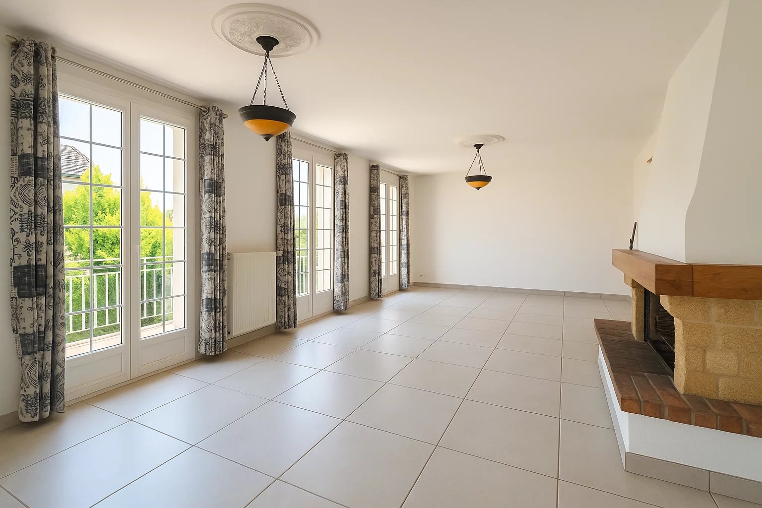 Dès l’entrée. un hall chaleureux avec boiseries en chêne vous guide vers un vaste salon-séjour traversant. baigné de lumière. avec cheminée. créant une atmosphère douce et conviviale. Il s’ouvre sur un grand balcon offrant une vue dégagée sur le jardin clos et arboré — parfait pour se détendre en toute tranquillité.