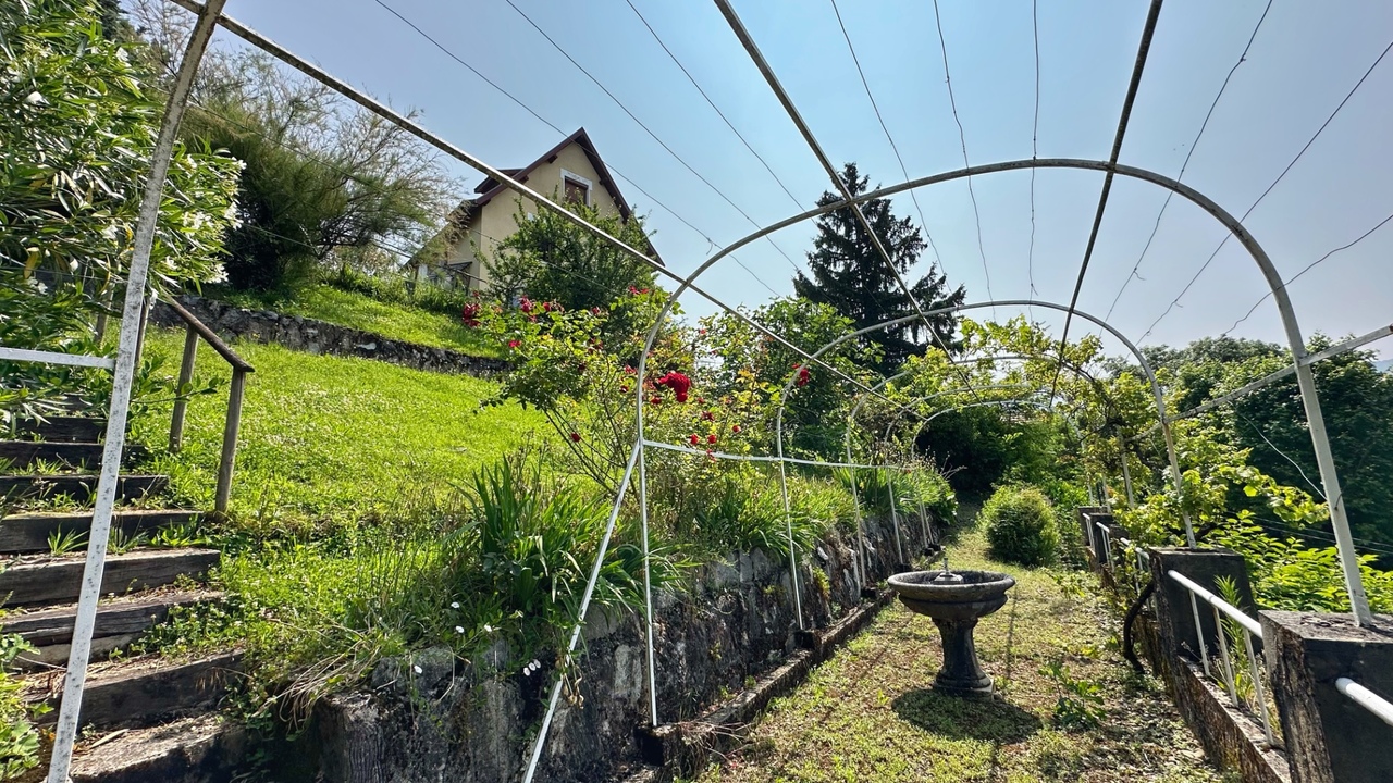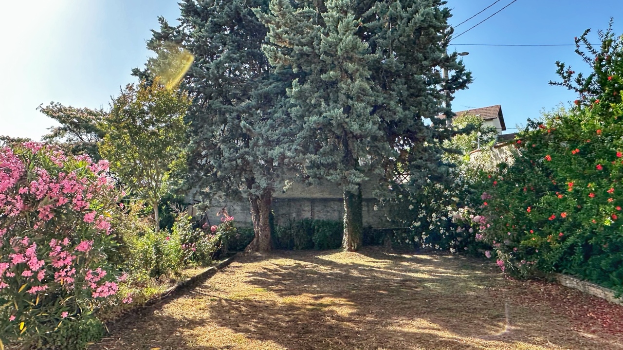 Terrain clos et arboré en partie en pente d'environ 1080 m² exposé SUD/OUEST, avec terrasse en partie abritée et store banne automatique, bassin, source, abri bois de 6,70 m², potager avec point d’eau et parking non attenant.