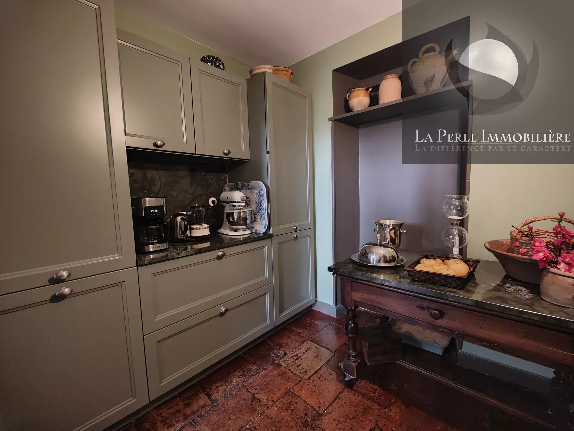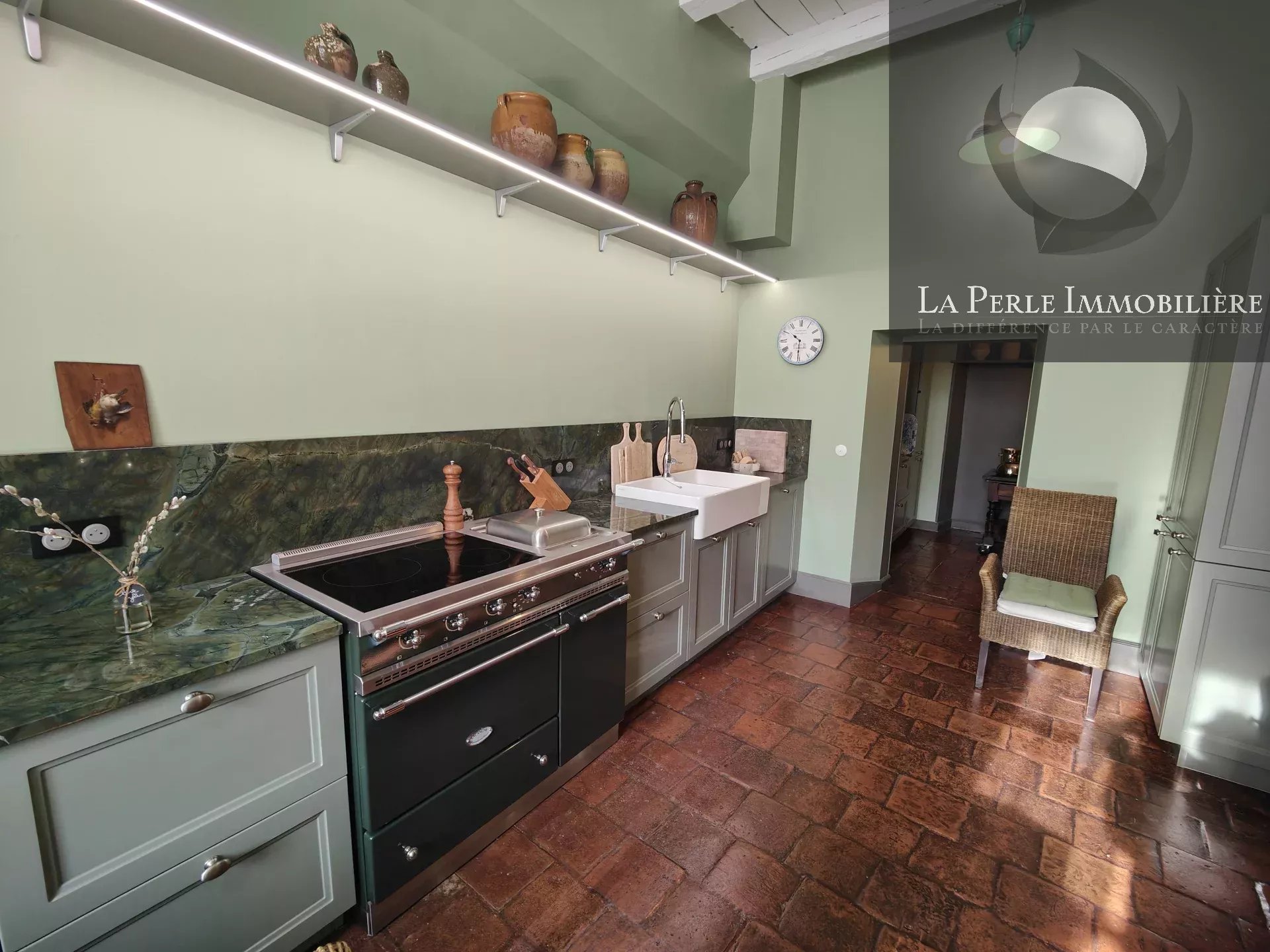 RDC : Couloir, buanderie, toilettes avec lave mains et vestiaire, grand salon avec poêle à granulé, chambre avec douche, cuisine entièrement refaite à neuf avec piano Lacanche et arrière cuisine équipée de rangements.