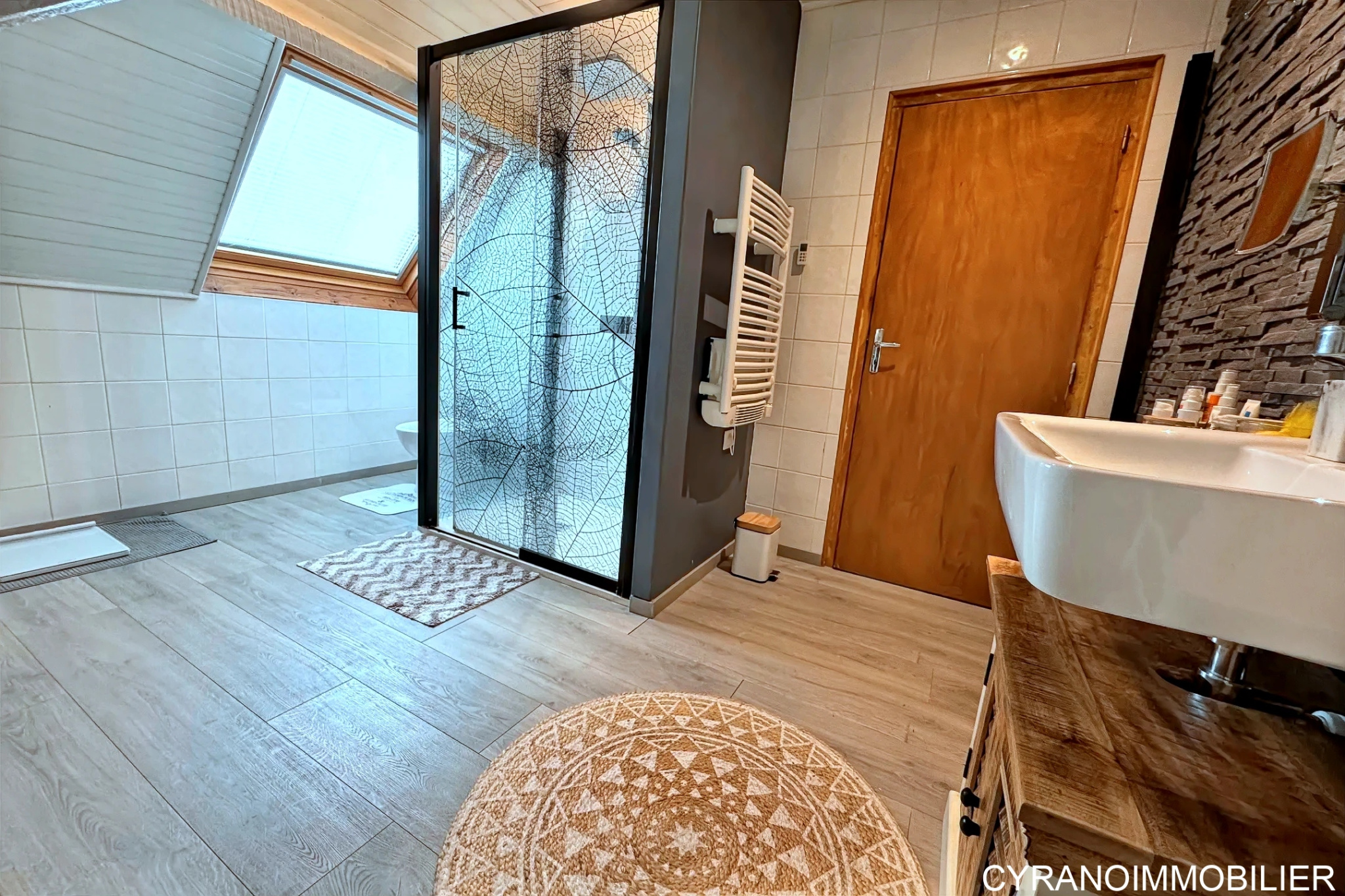 Maison de construction traditionnelle de 243 m2 hab, offrant en REZ DE CHAUSSEE: 2 chambres, 1 dressing (ou chambre), une salle de bains + douche, un wc indépendant, une cuisine éqiuipée ouverte sur terrasse, une buanderie/cellier, double séjour avec poele à granules.
