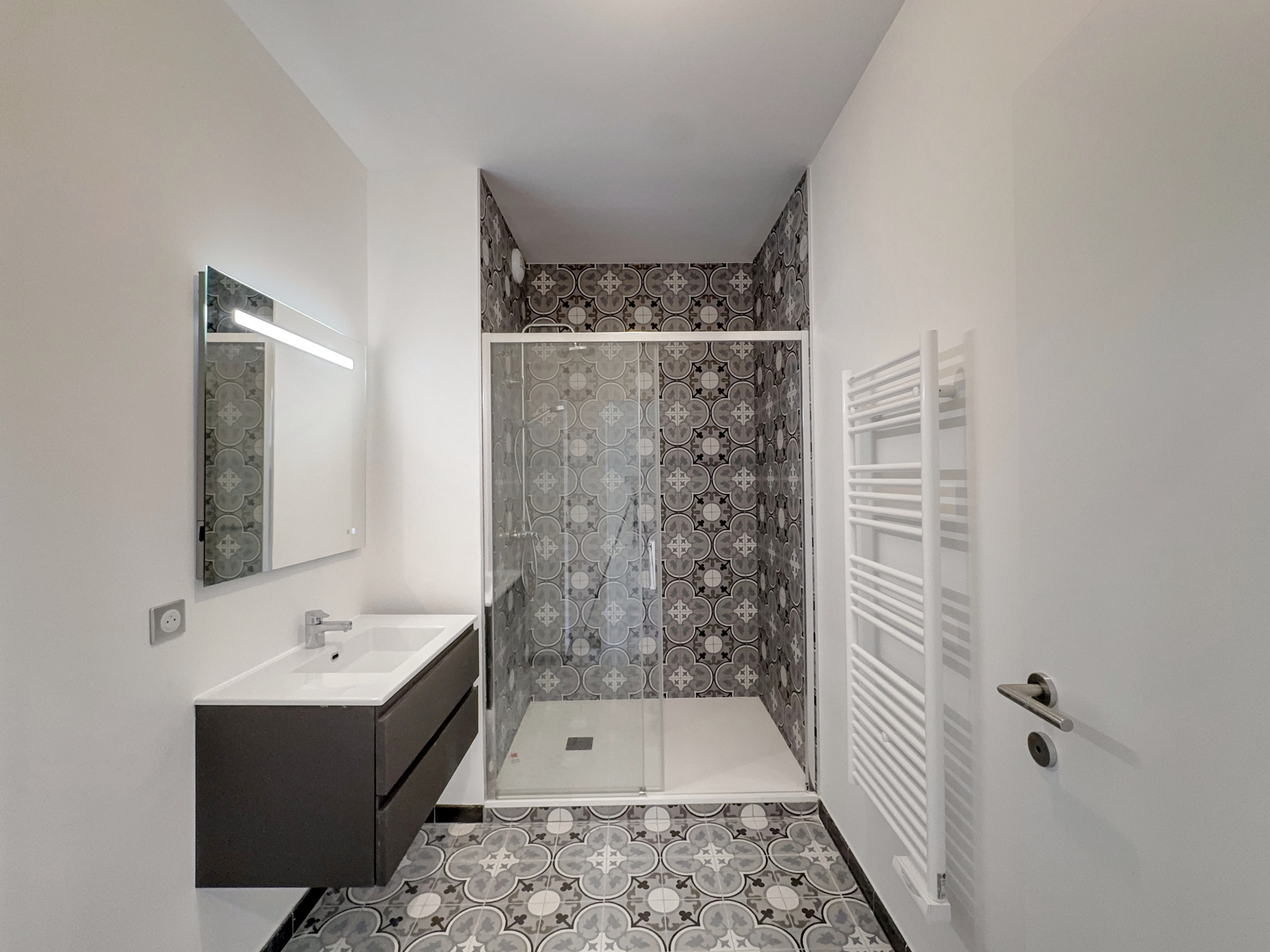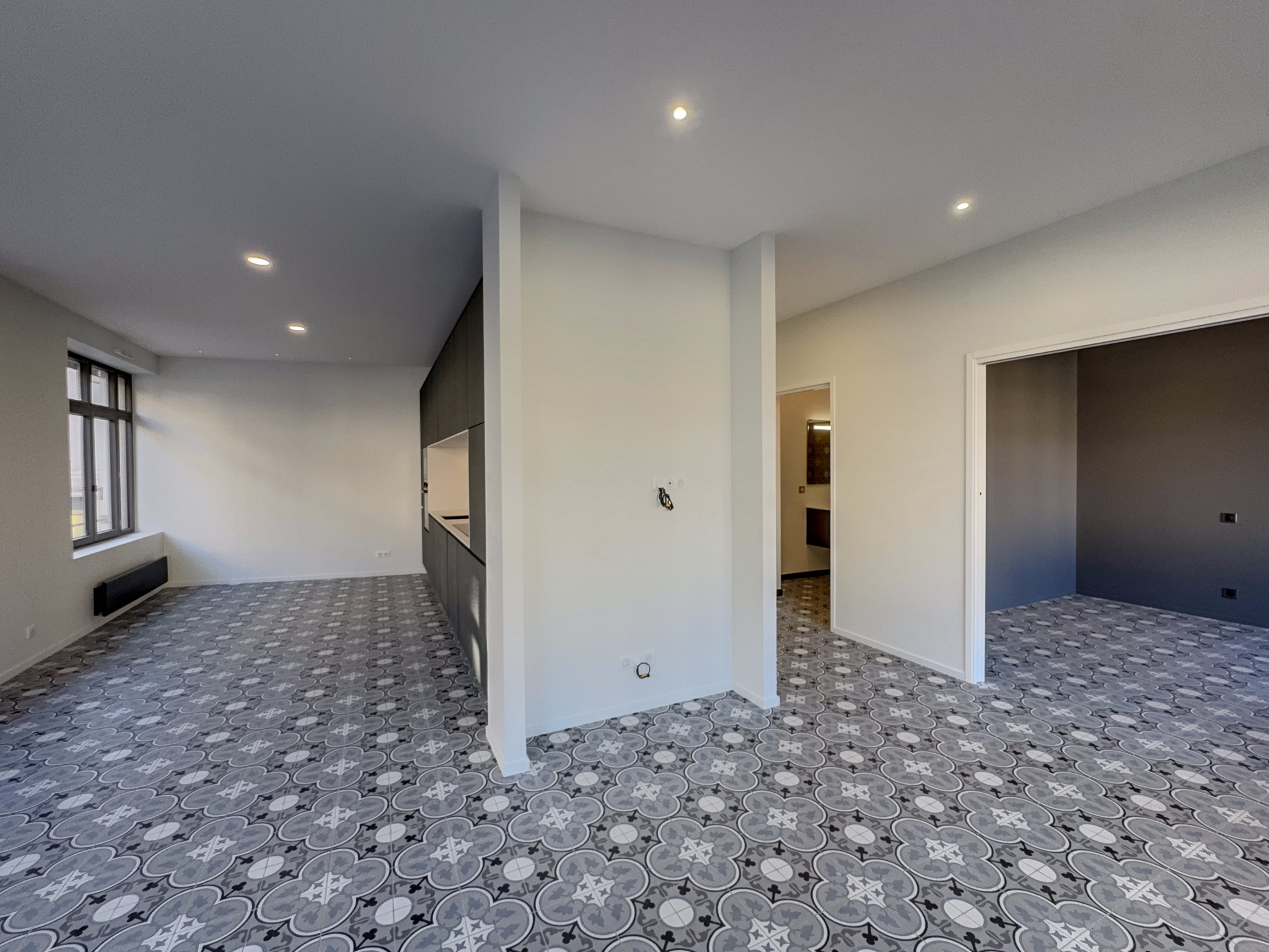 Une entrée avec des rangements, un WC indépendant, une salle d'eau avec une vaste douche à l'italienne, une pièce de vie baignée de lumière et cuisine ouverte de grand standing entièrement équipée. Une chambre spacieuse avec vue sur le square.