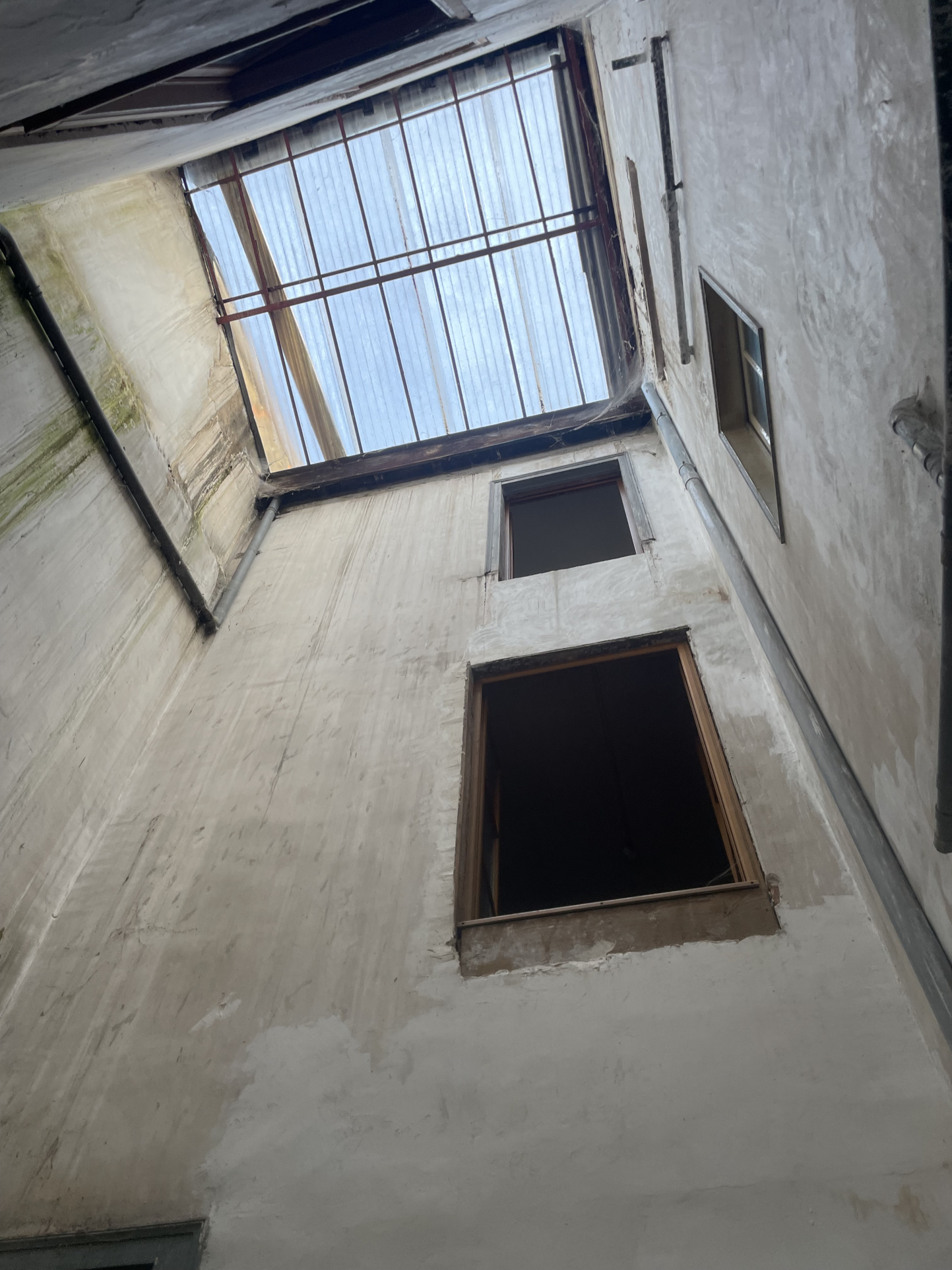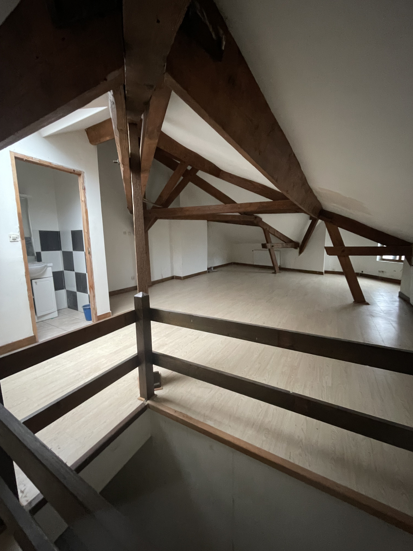 * Au 2 et 3ième étage : appartement F4 en duplex (entrée, cuisine, salon, deux chambres, salle de bains, grande pièce mansardée avec charpente apparente et toilettes).