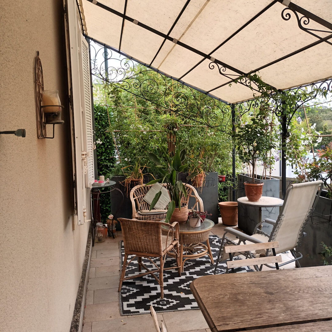 * en rez - de - chaussée : une jolie entrée avec terrazzo au sol, cuisine équipée entièrement refaite avec son coin salle à manger depuis laquelle nous avons accès à une charmante pergola. Vient ensuite une double pièce séjour d'environ 50 m2 avec cheminée et accès à un charmant jardin.