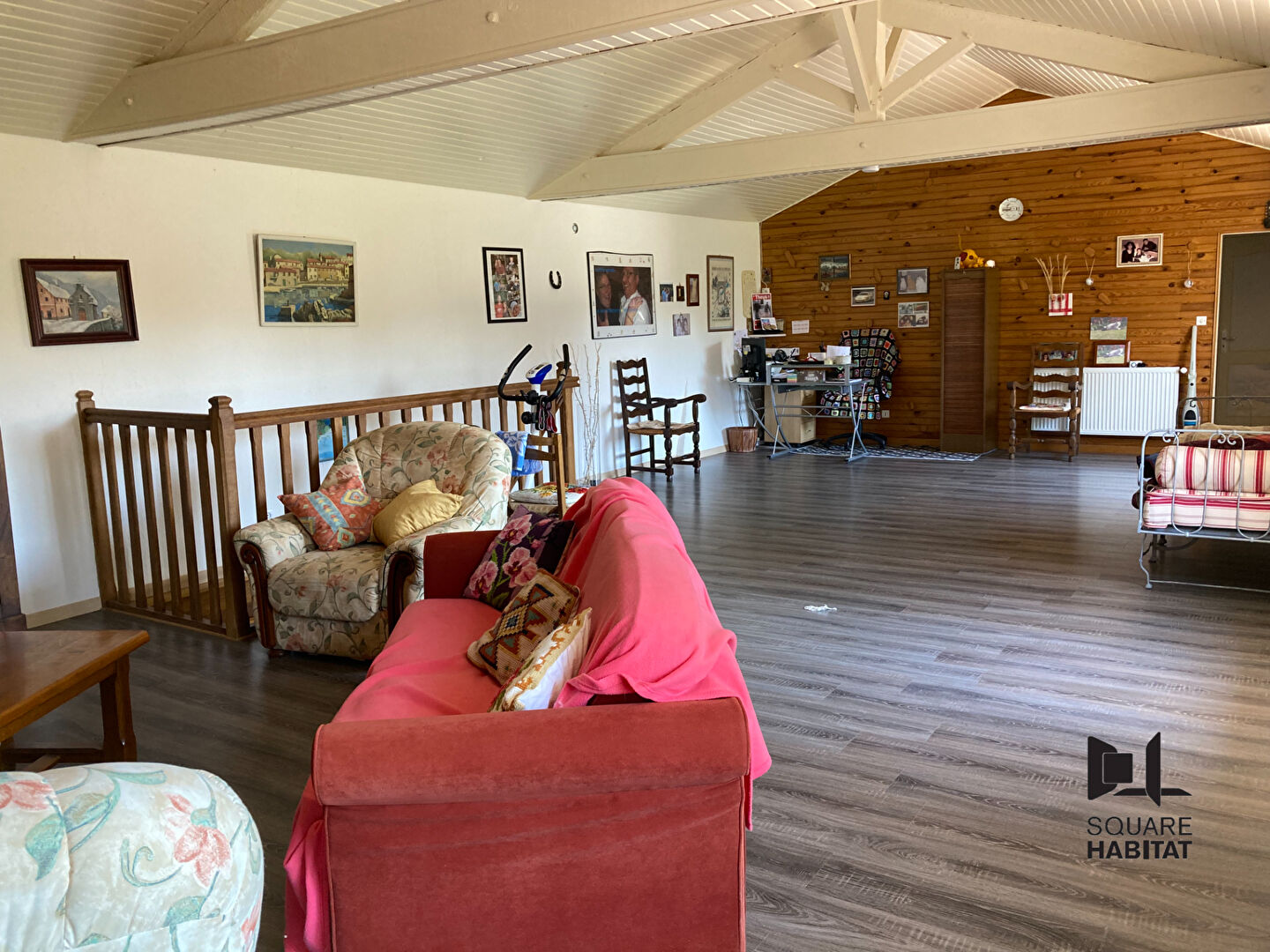 A l'étage : une grande mezzanine d'environ 60m2 lumineuse, 3 chambres, une salle d'eau avec WC.