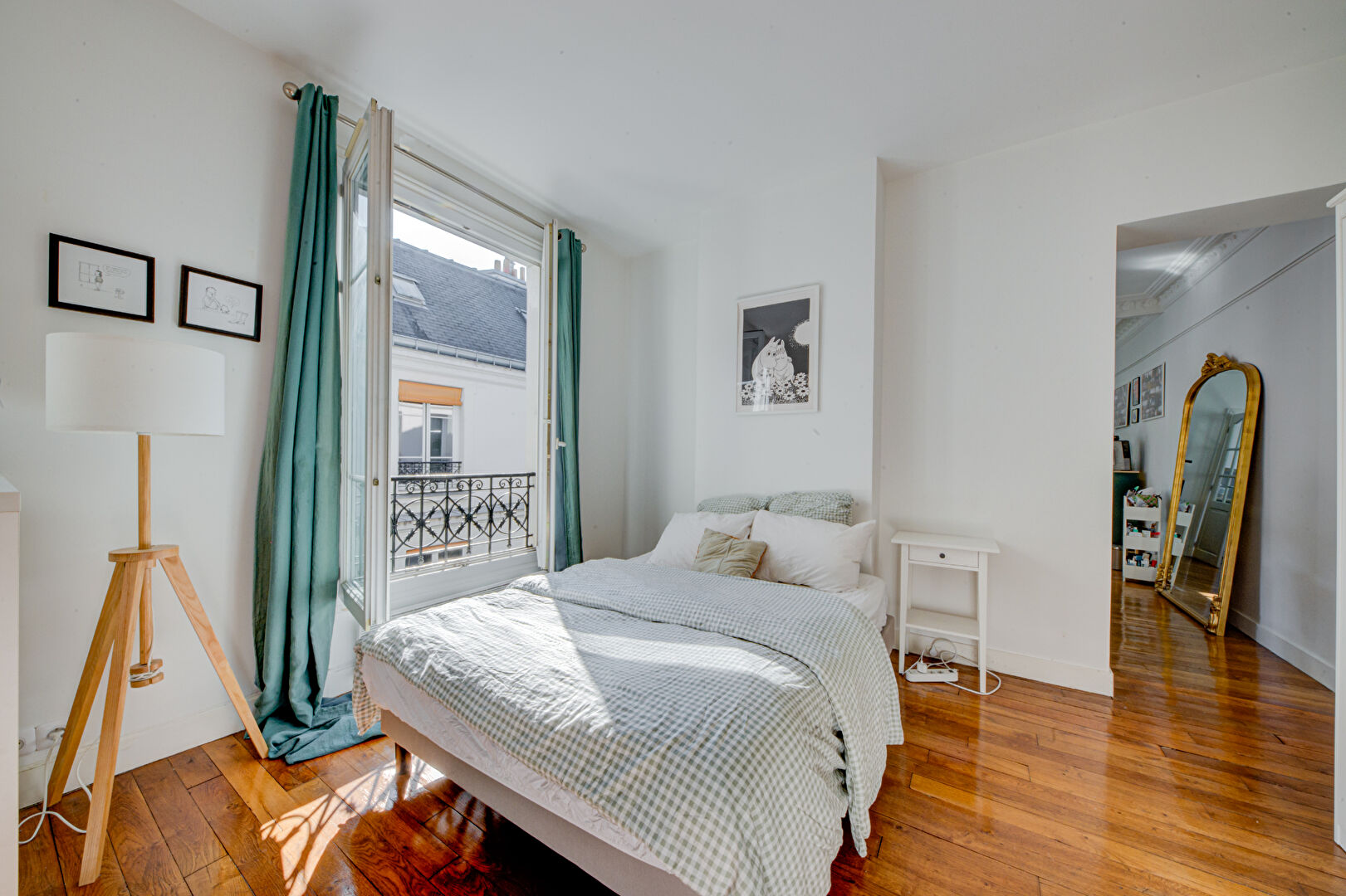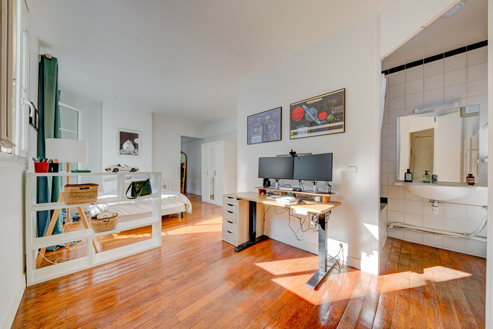 Rue Marguerite de Rochechouart - 2 p 53.80m² au 5éme étage sans ascenseur dans bel immeuble Hausmannien avec charme de l'ancien parquet / moulure et cheminée au 5éme sans ascenseur avec un plan inversé comprenant une entrée - une chambre avec salle de bain semi-ouverte - séjour - cuisine - WC séparés - chauffage et eau chaude électrique.