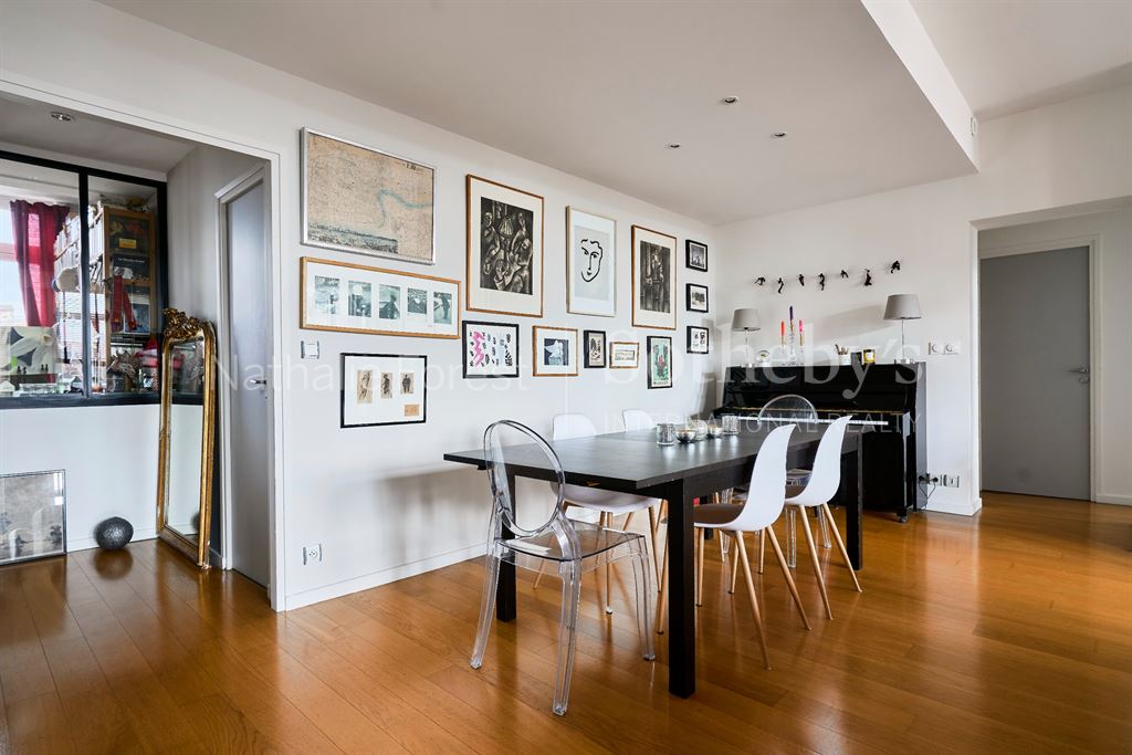 Le grand séjour de 40 m², entièrement parqueté, est baigné de lumière grâce à ses nombreuses fenêtres exposées Sud-Est (double vitrage intégral). Il se compose d'un espace salle à manger et d'un espace living avec une cheminée fonctionnelle.