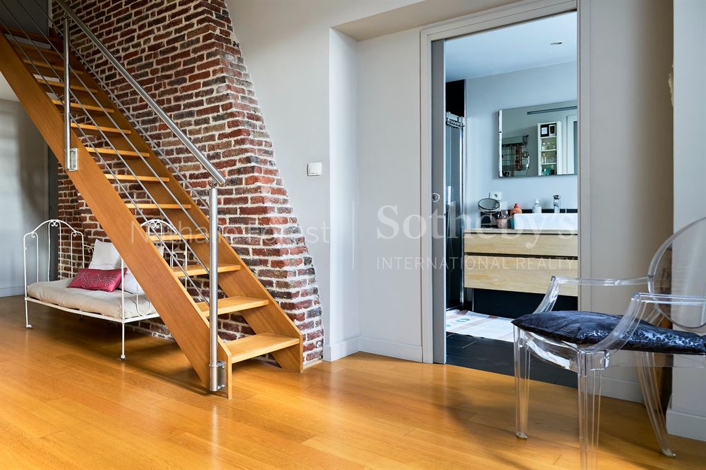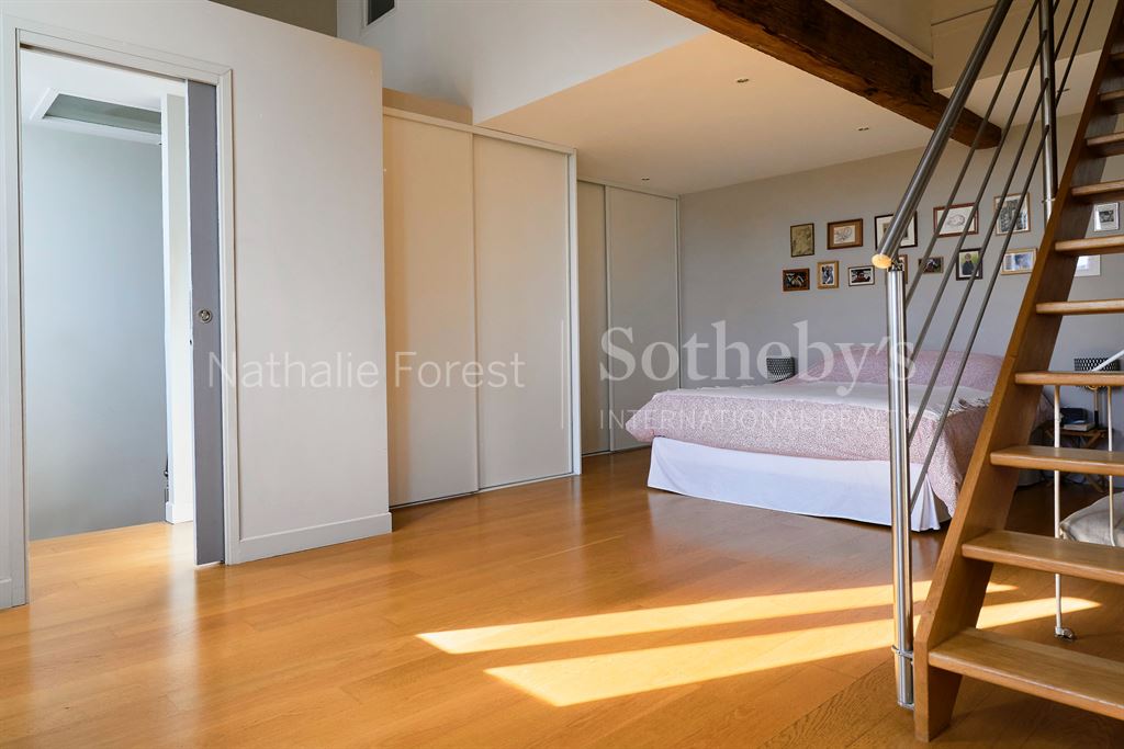 À l'étage, un escalier mène à un superbe espace parental composé d'une grande chambre avec de nombreux placards, une salle de bains complète, et en mezzanine, un bureau et un dressing.