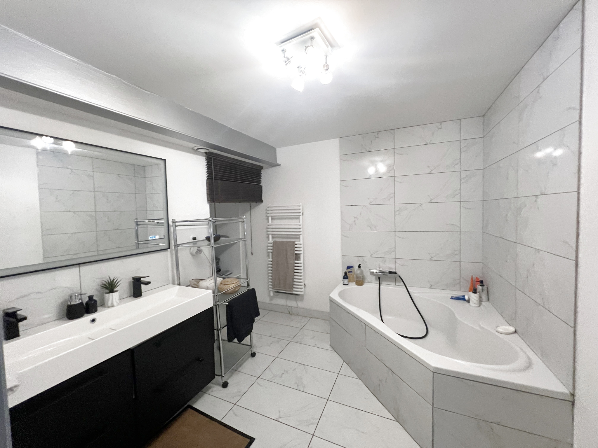 Une salle de bain avec baignoire d'angle, ainsi qu'un WC séparé.