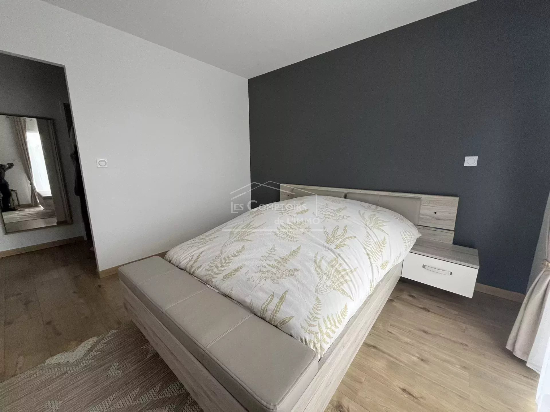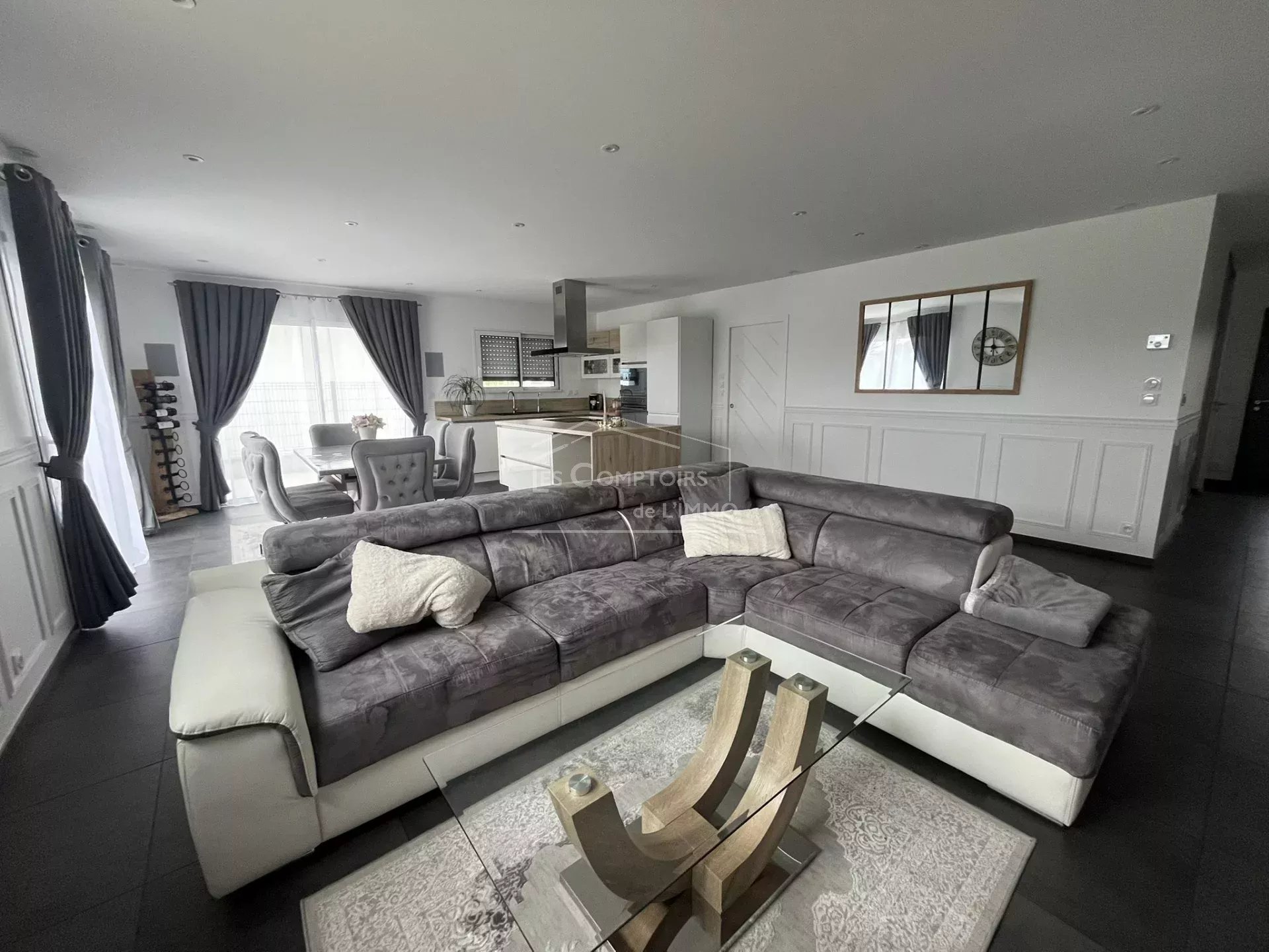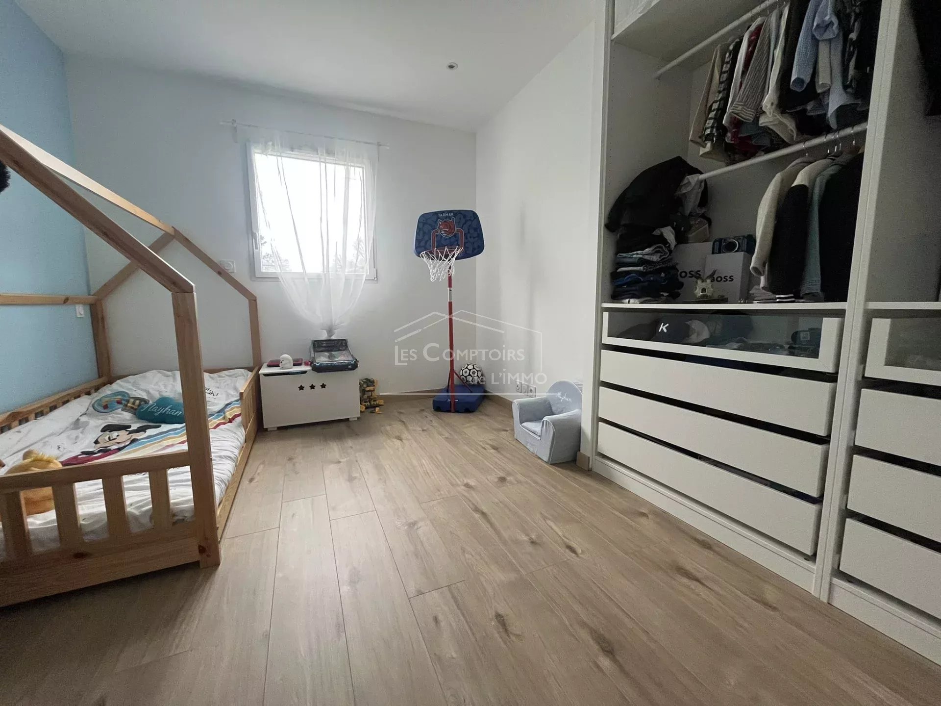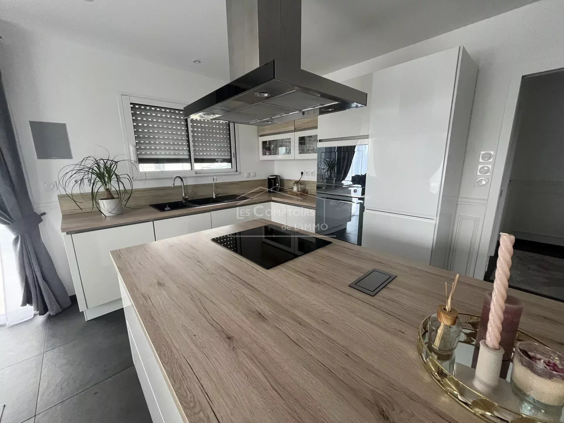 entrée, toilettes, cuisine A/E (plaque, hotte, four, micro-onde) ouverte sur le séjour, deux salles de bains, une buanderie, une chambre parentale avec dressing, deux chambres, ainsi qu'un garage attenant à la maison.