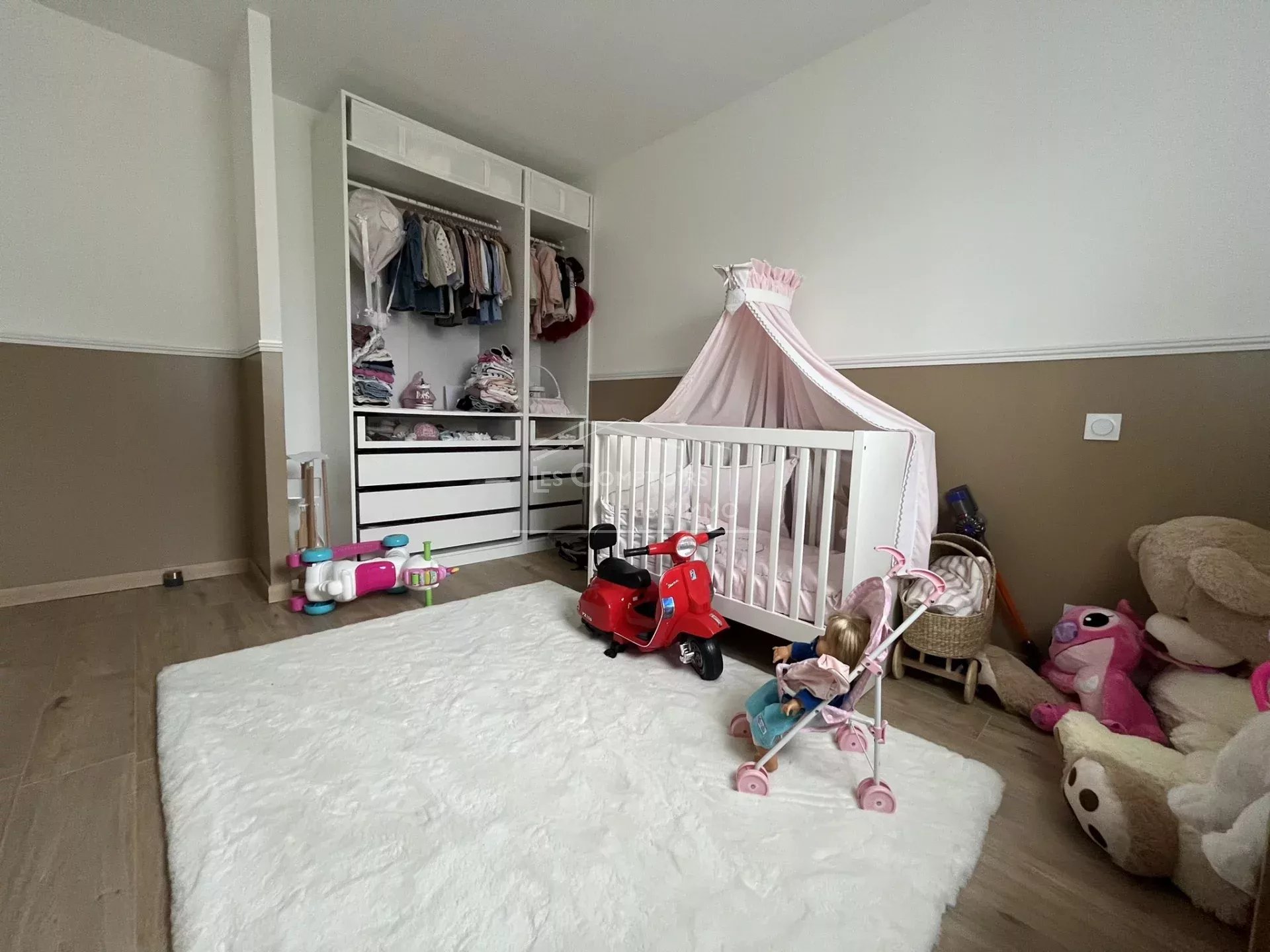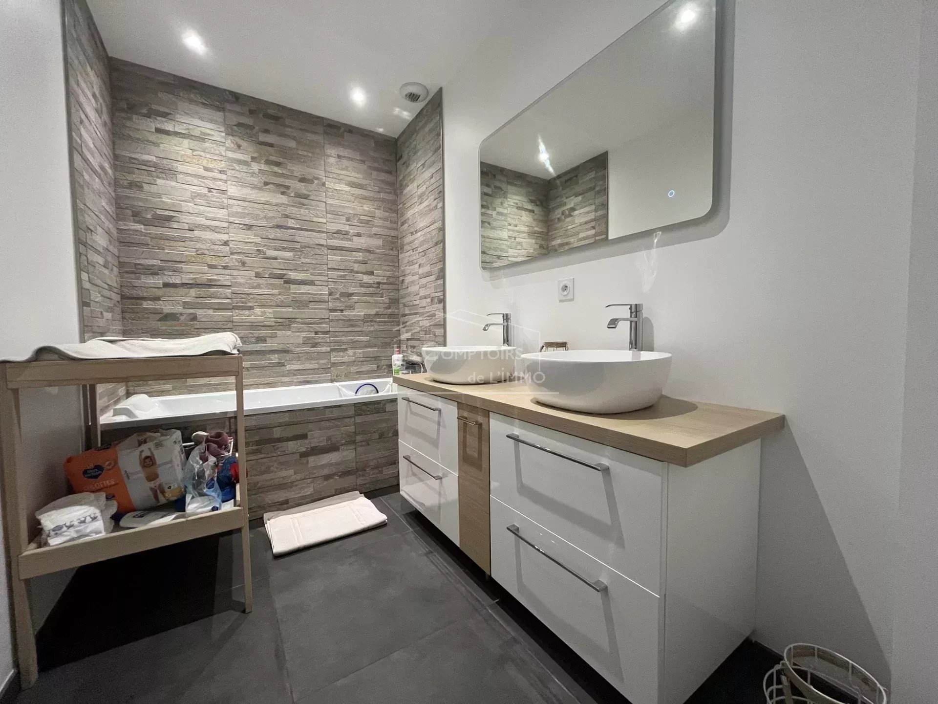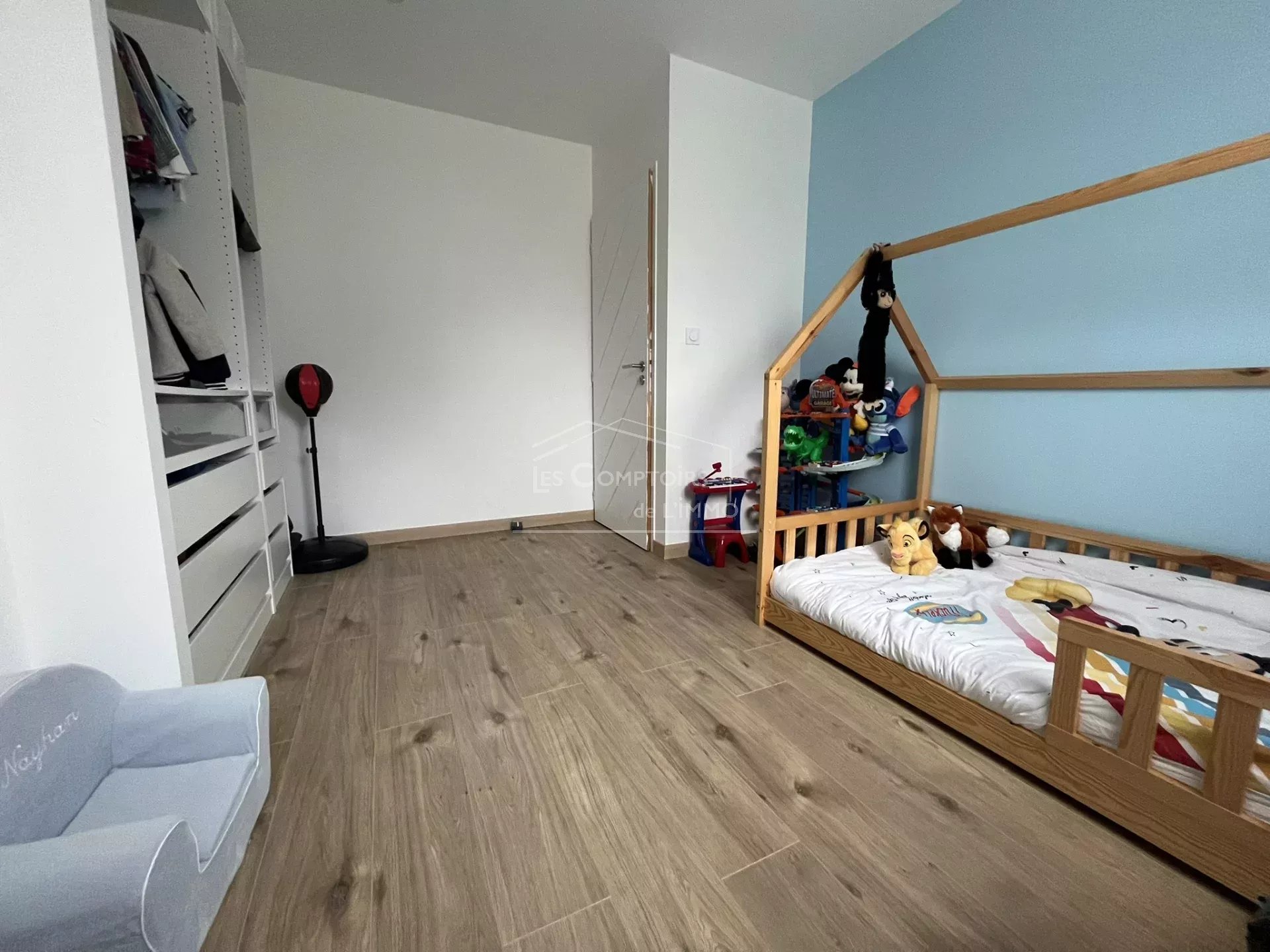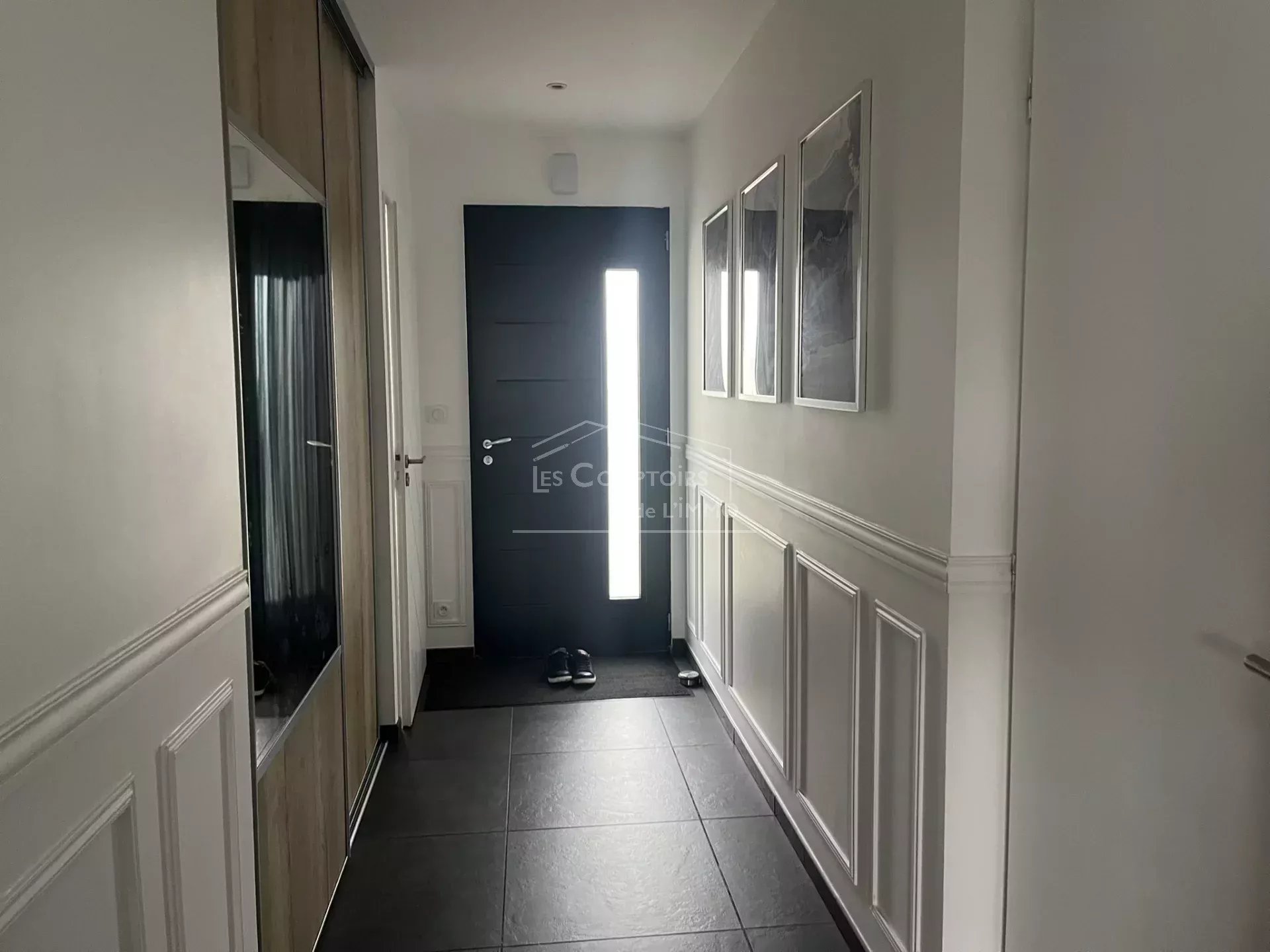 entrée, toilettes, cuisine A/E (plaque, hotte, four, micro-onde) ouverte sur le séjour, deux salles de bains, une buanderie, une chambre parentale avec dressing, deux chambres, ainsi qu'un garage attenant à la maison.