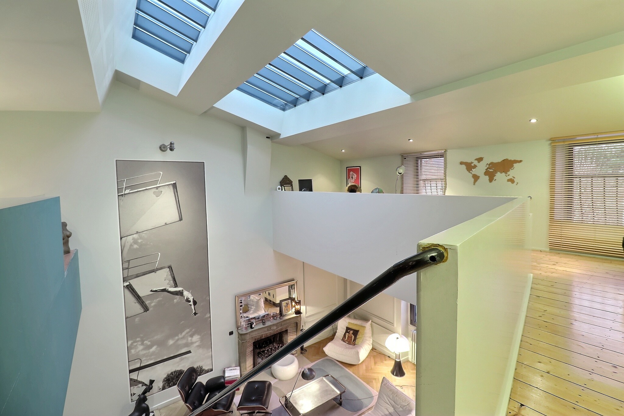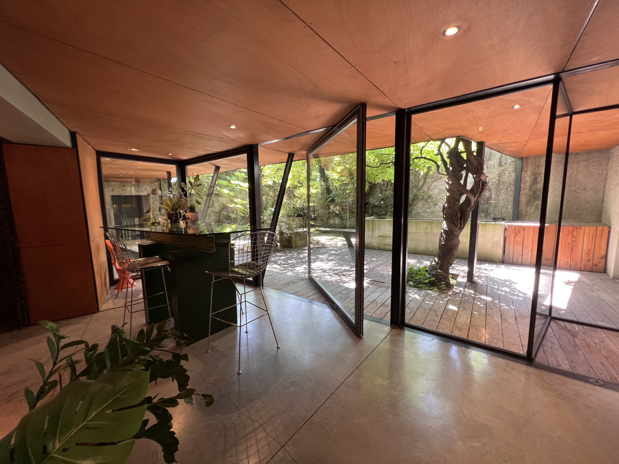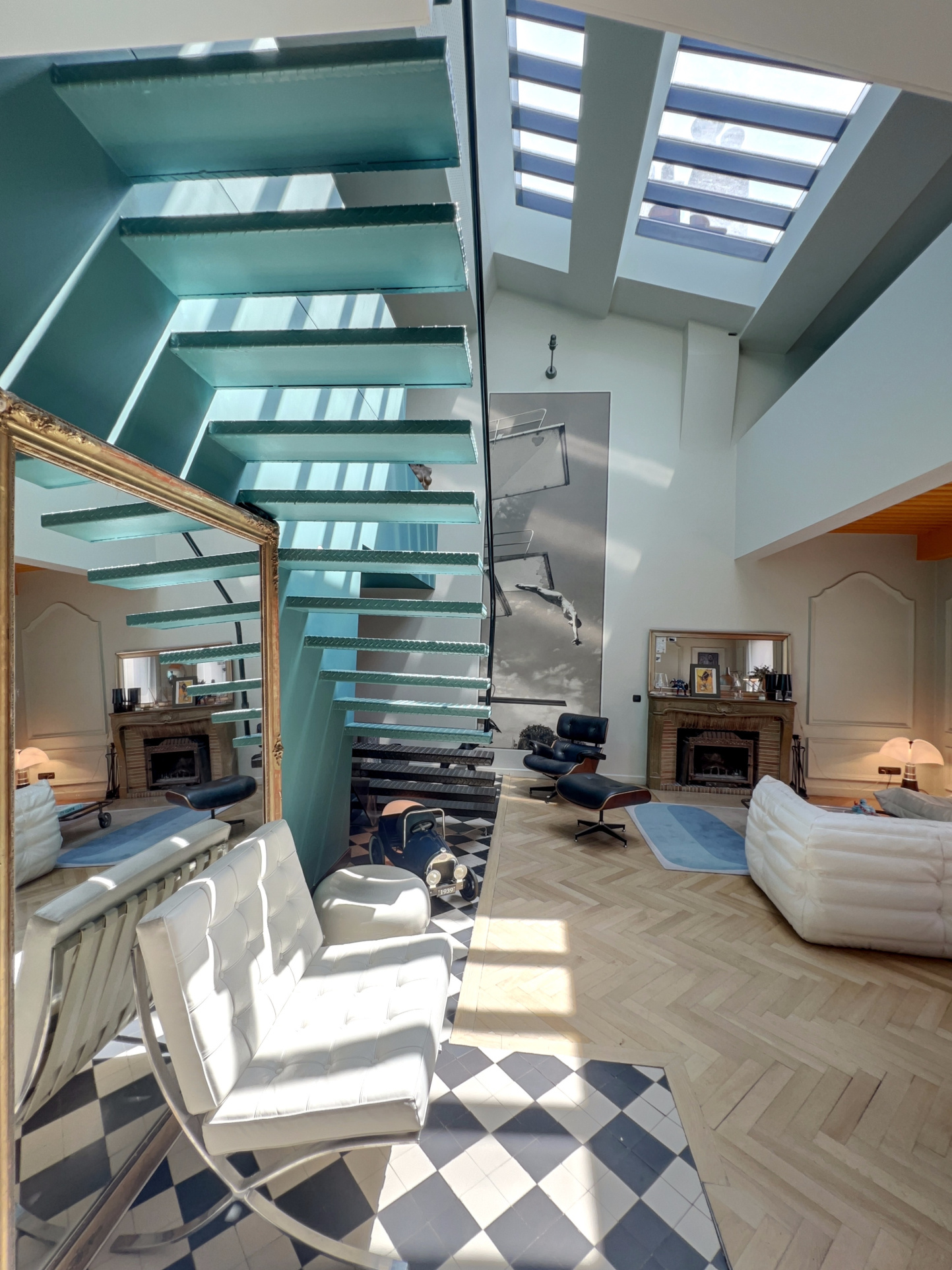 À l'étage, un vaste séjour baigné de lumière sous verrière dévoile une hauteur sous plafond de plus de 6 mètres. Une terrasse suspendue en coursive de 100 m2 mène à l'espace piscine en rooftop.