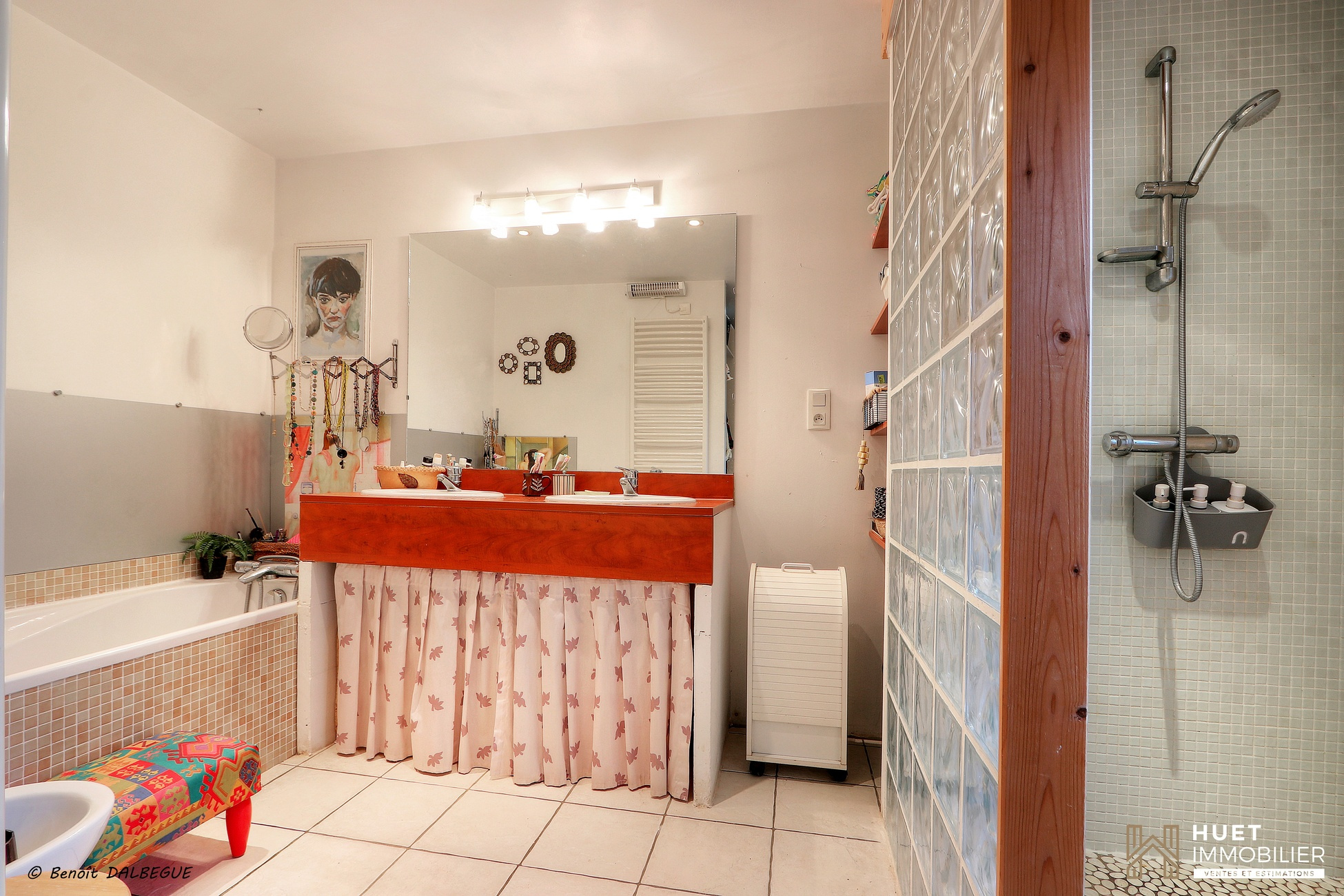 A l'étage, deux salles d'eau et trois chambres spacieuses offrent le confort nécessaire pour accueillir famille et invités. Un grenier à usage d'atelier de 28m2 complète cet étage.